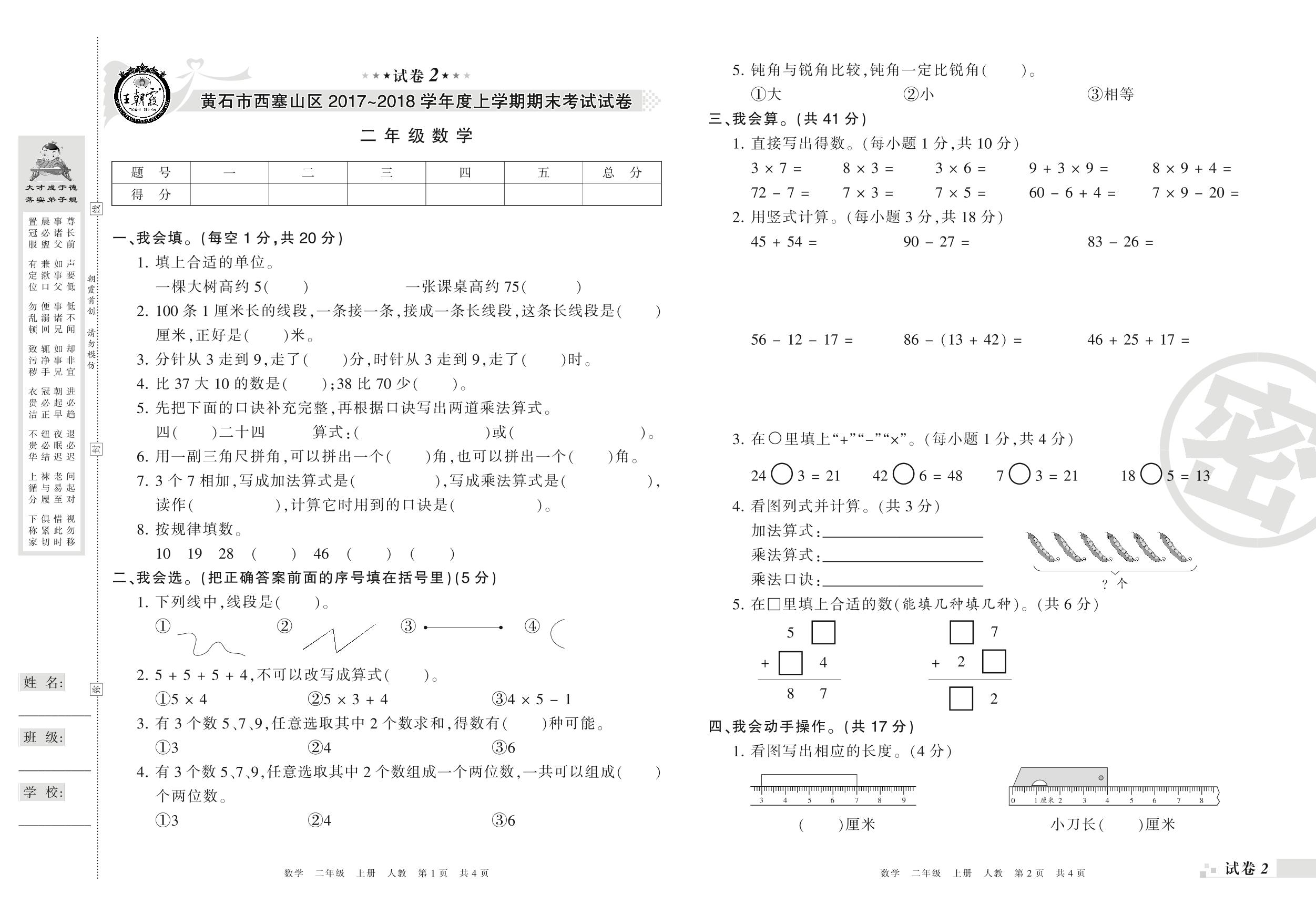2017-2018学年第一学期黄石市西塞山区二年级数学试卷(人教版)【2】