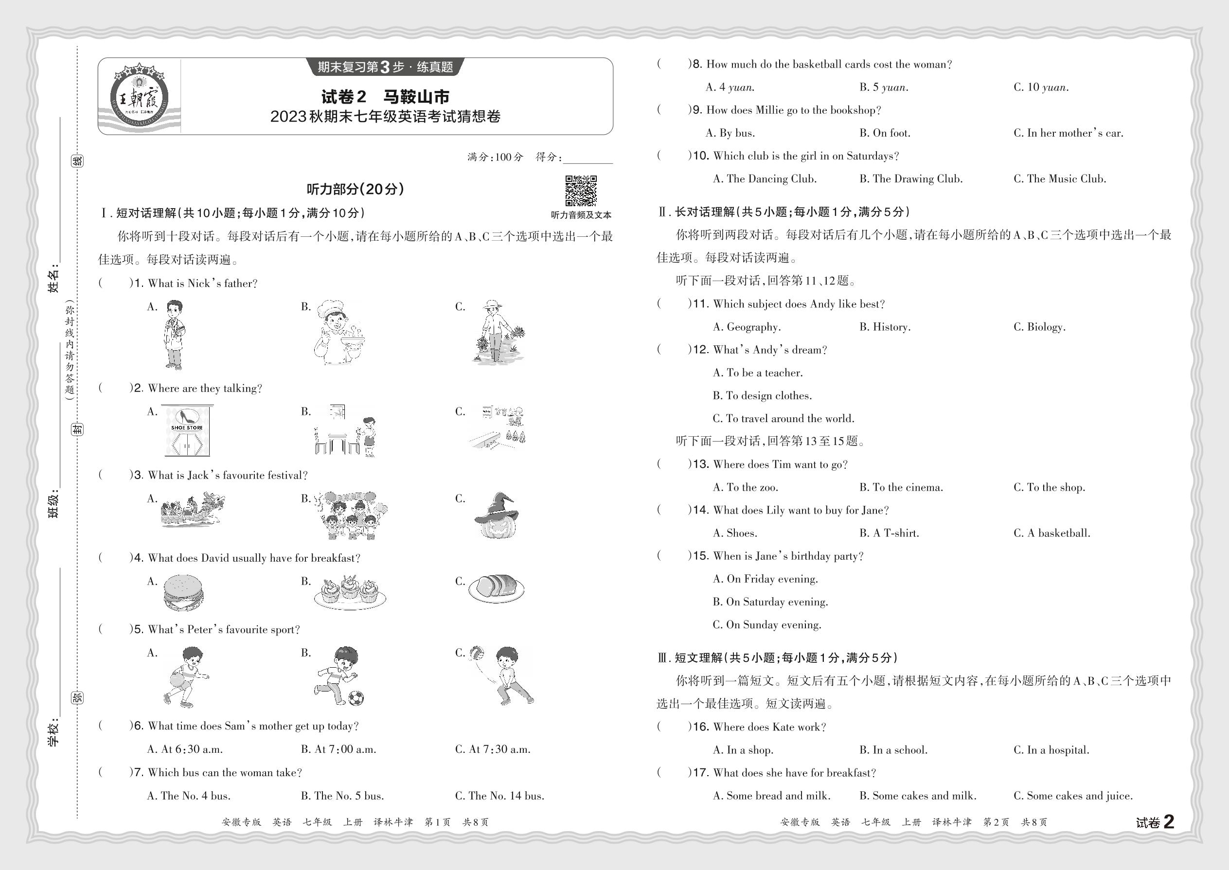 安徽省马鞍山市2023秋期末七年级英语考试猜想卷(译林牛津版)【2】