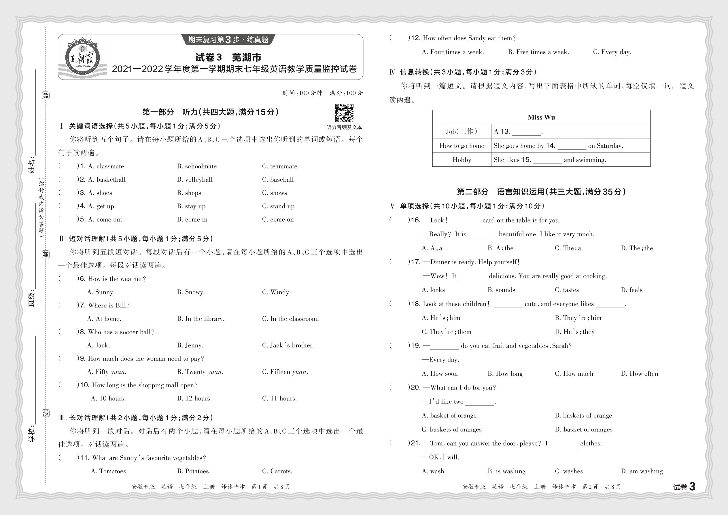 安徽省芜湖市2021—2022学年度第一学期期末七年级英语教学质量监控试卷(译林牛津版)【3】