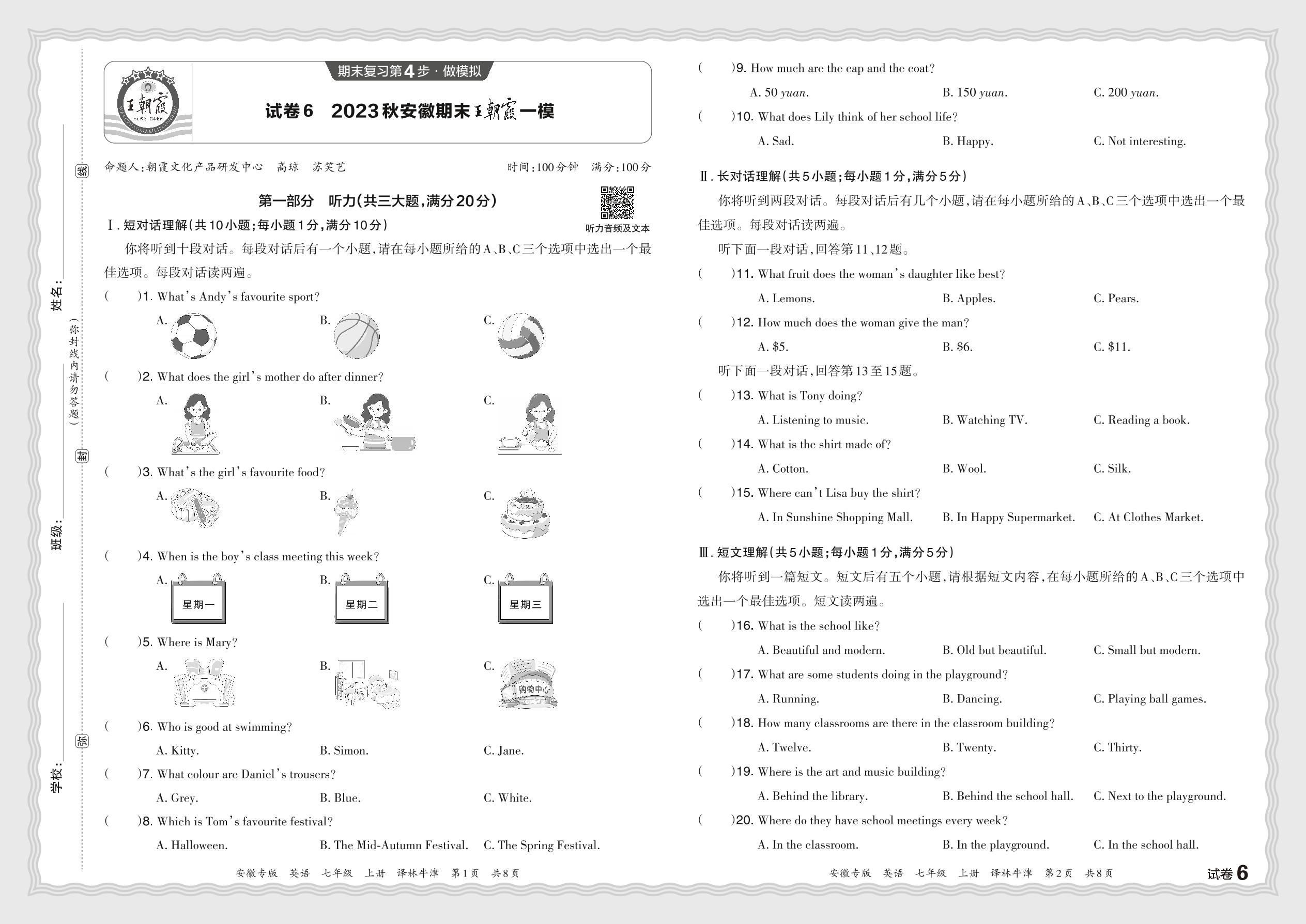 2023秋上册七年级英语译林牛津版 安徽期末王朝霞一模