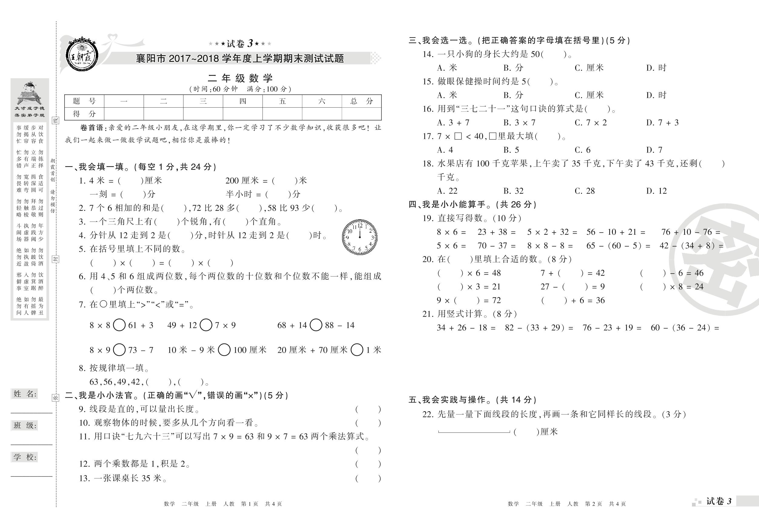 2017-2018学年第一学期襄阳市二年级数学试卷(人教版)【3】