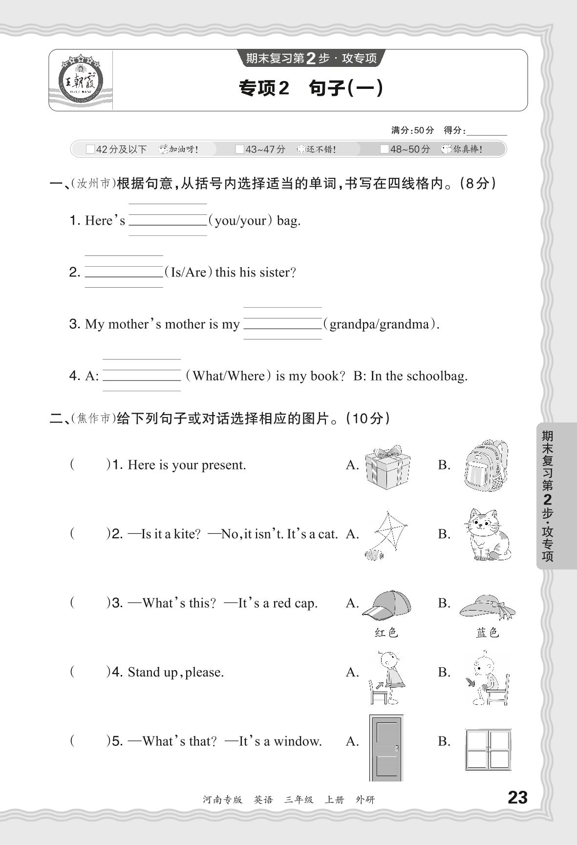 2023秋上册三年级英语外研版 期末专项卷·句子(一)【2】