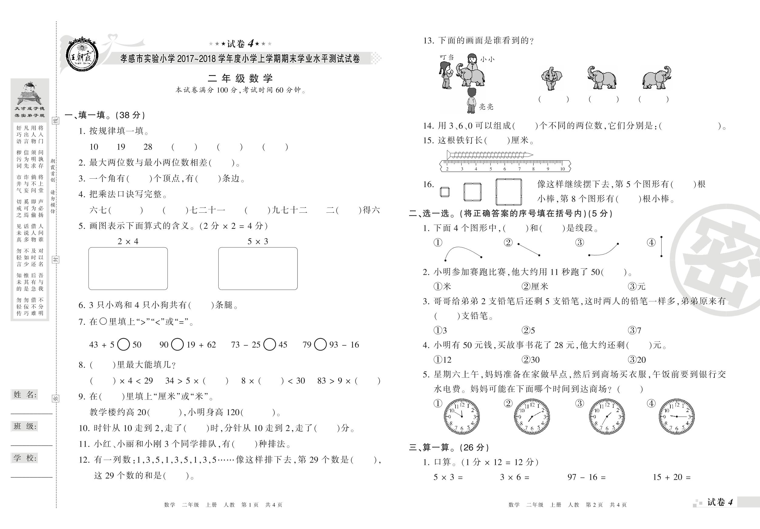 2017-2018学年第一学期孝感市实验小学二年级数学试卷(人教版)【4】