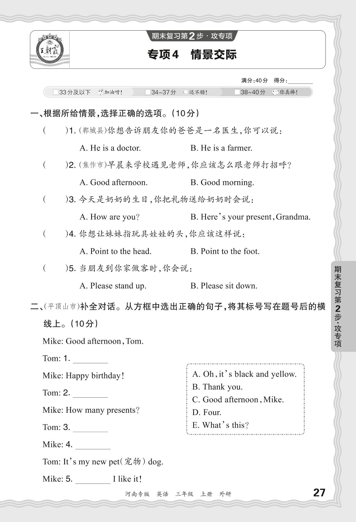 2023秋上册三年级英语外研版 期末专项卷·情景交际【4】