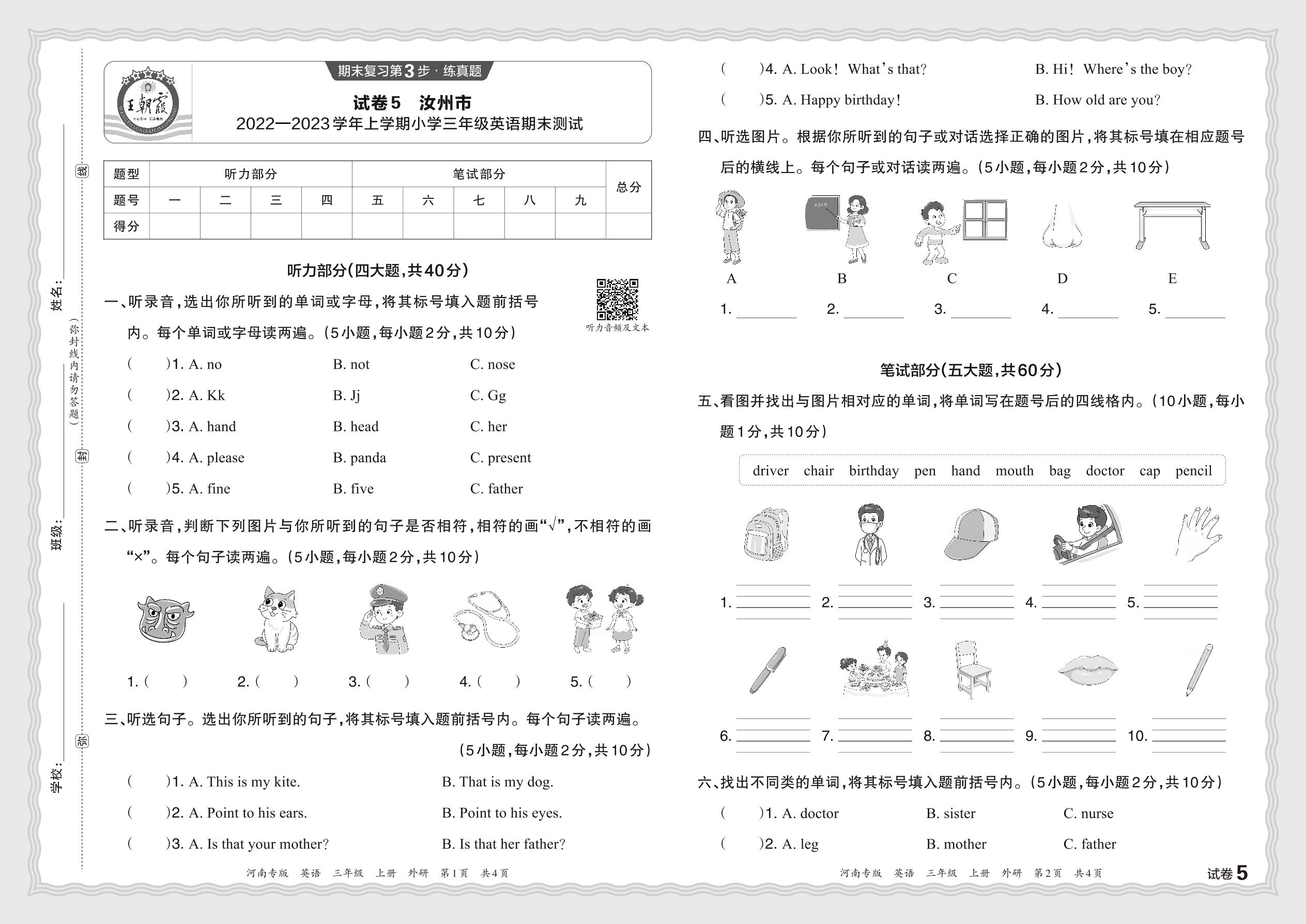 河南省平顶山市汝州市2022—2023学年上学期三年级英语期末测试(外研版)【5】