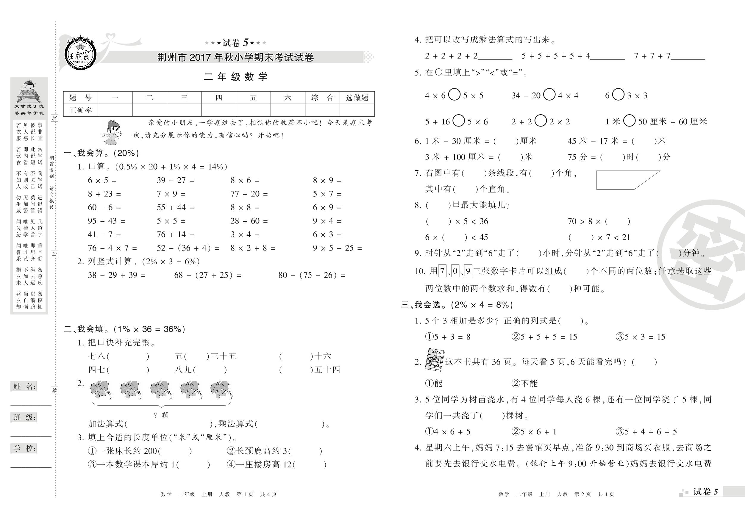 2017-2018学年第一学期荆州市二年级数学试卷(人教版)【5】