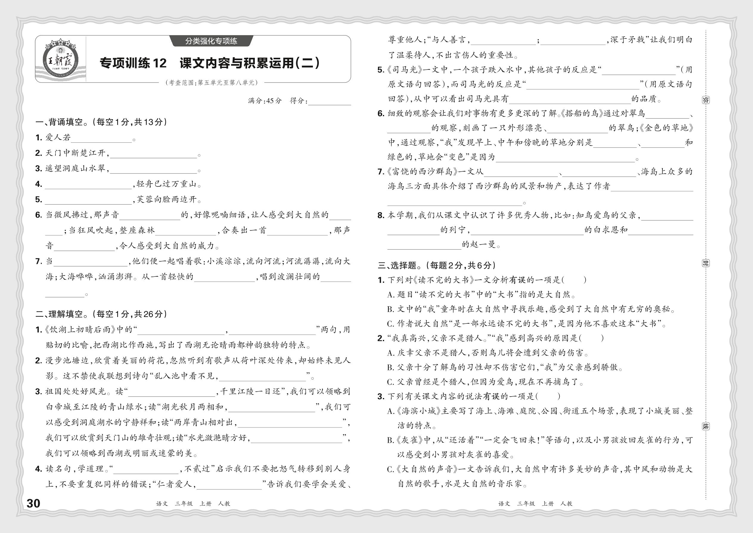 2023秋上册三年级语文人教版 期末专项·课文内容与积累运用(二)【12】