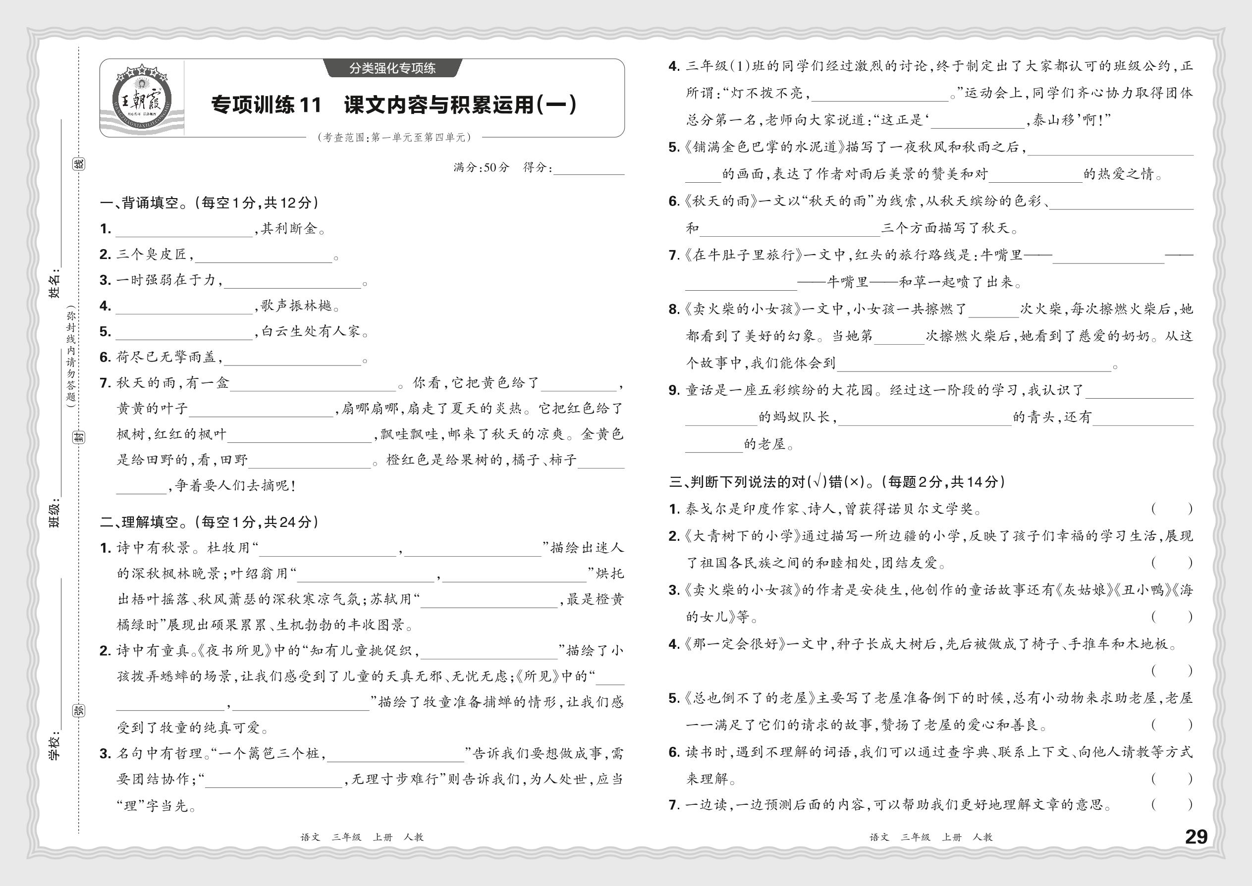 2023秋上册三年级语文人教版 期末专项·课文内容与积累运用(一)【11】