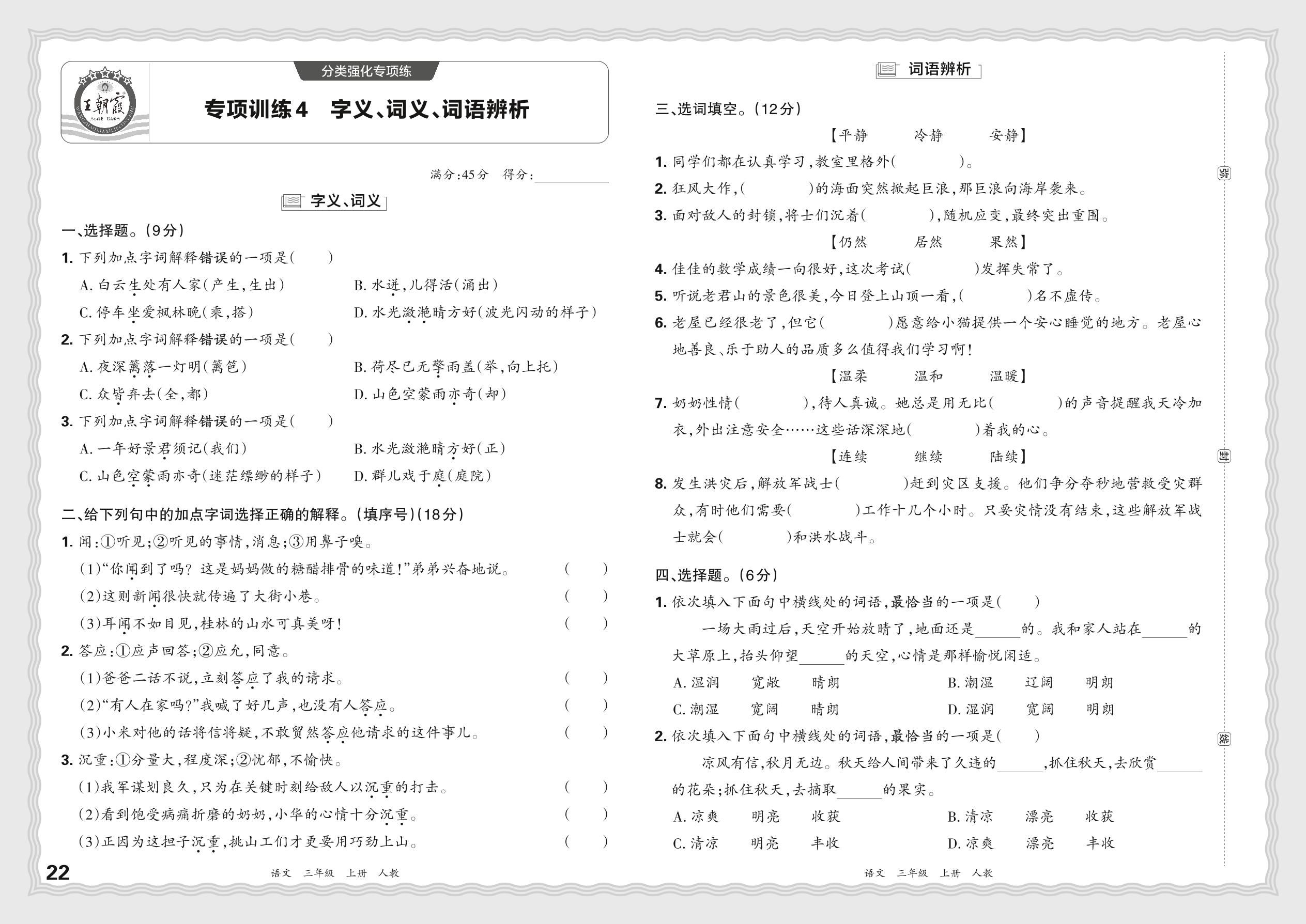 2023秋上册三年级语文人教版 期末专项·字义、词义、词语辨析【4】