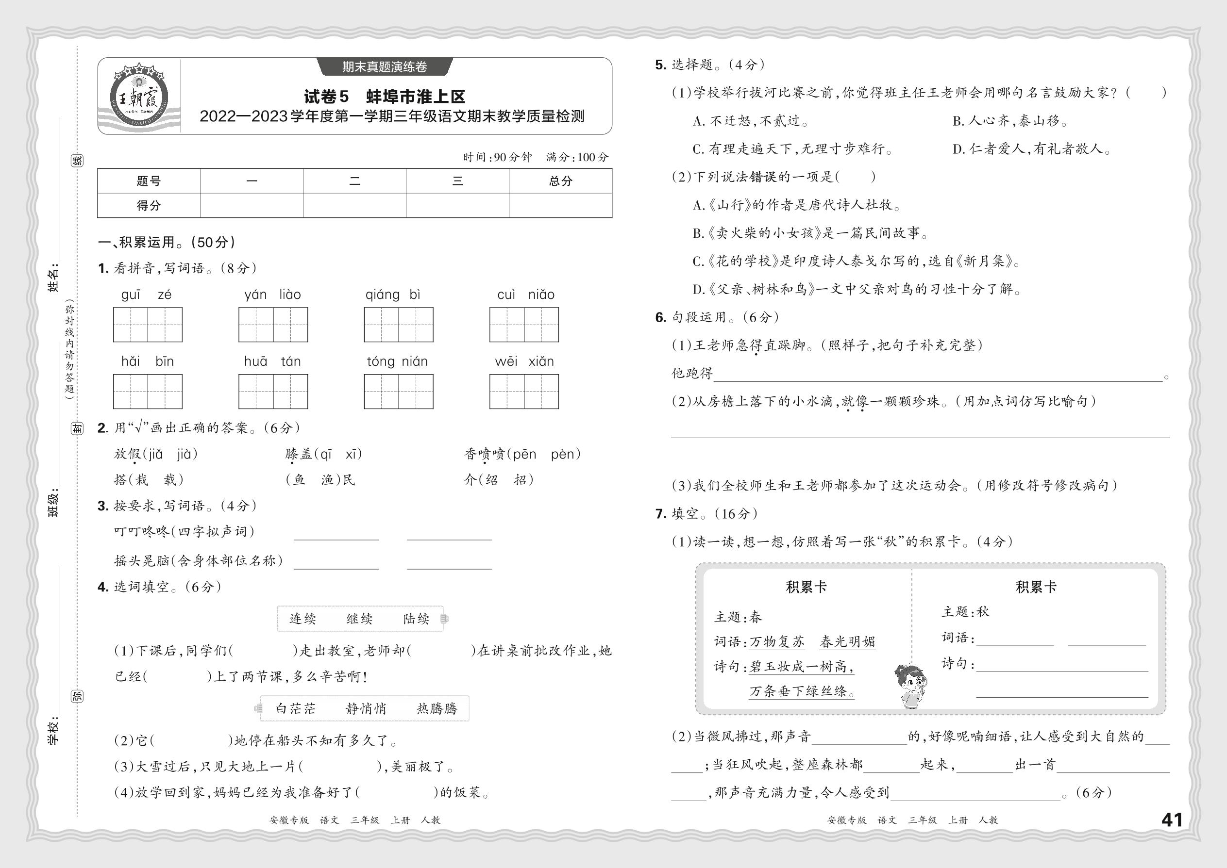 安徽省蚌埠市淮上区2022—2023学年度第一学期三年级语文期末教学质量检测(人教版)【5】