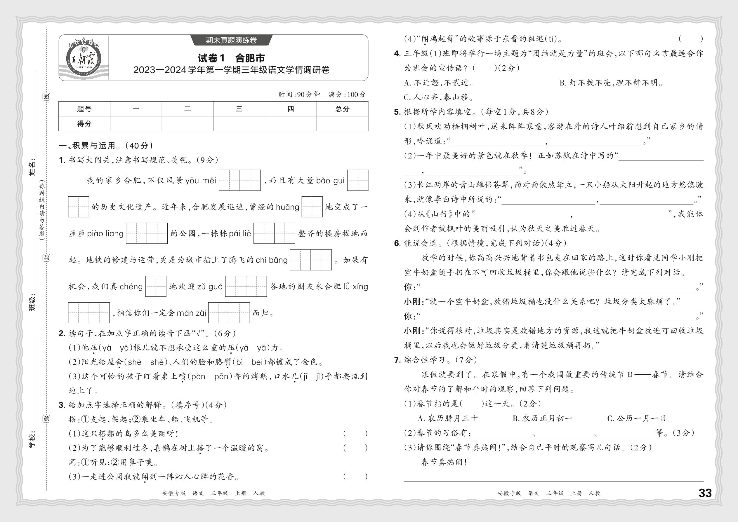 安徽省合肥市2023—2024学年第一学期三年级语文学情调研卷(人教版)【1】