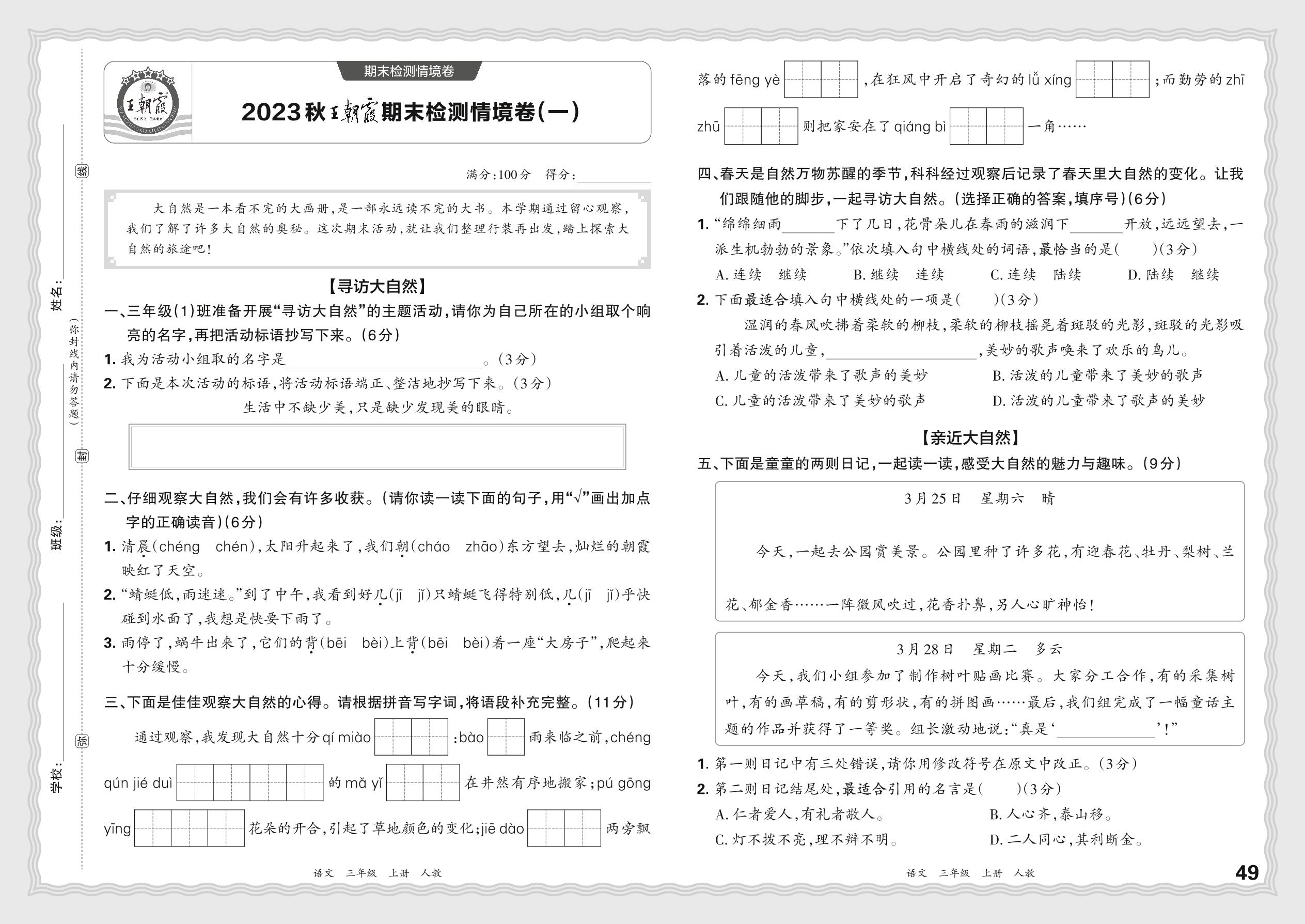 2023秋上册三年级语文人教版 王朝霞期末检测情境卷(一)