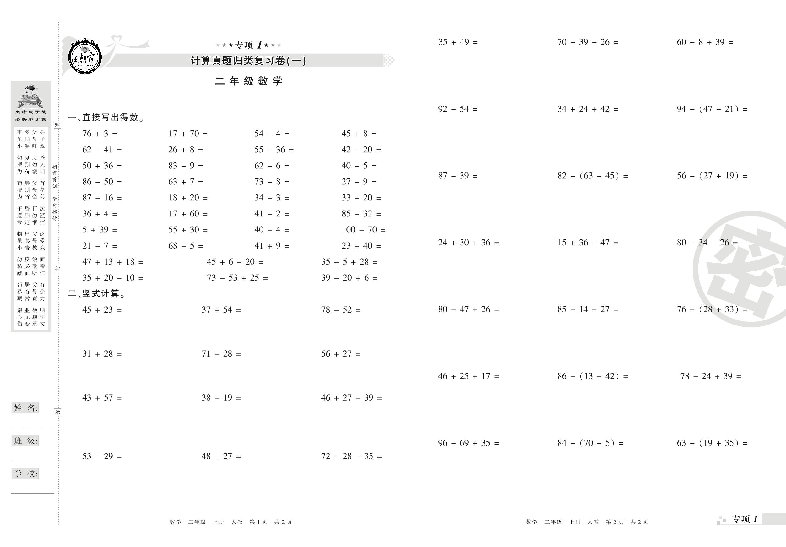 王朝霞期末专项卷——计算(一)(二)真题归类复习卷二年级上册数学(人教版)_R210803103634【0】