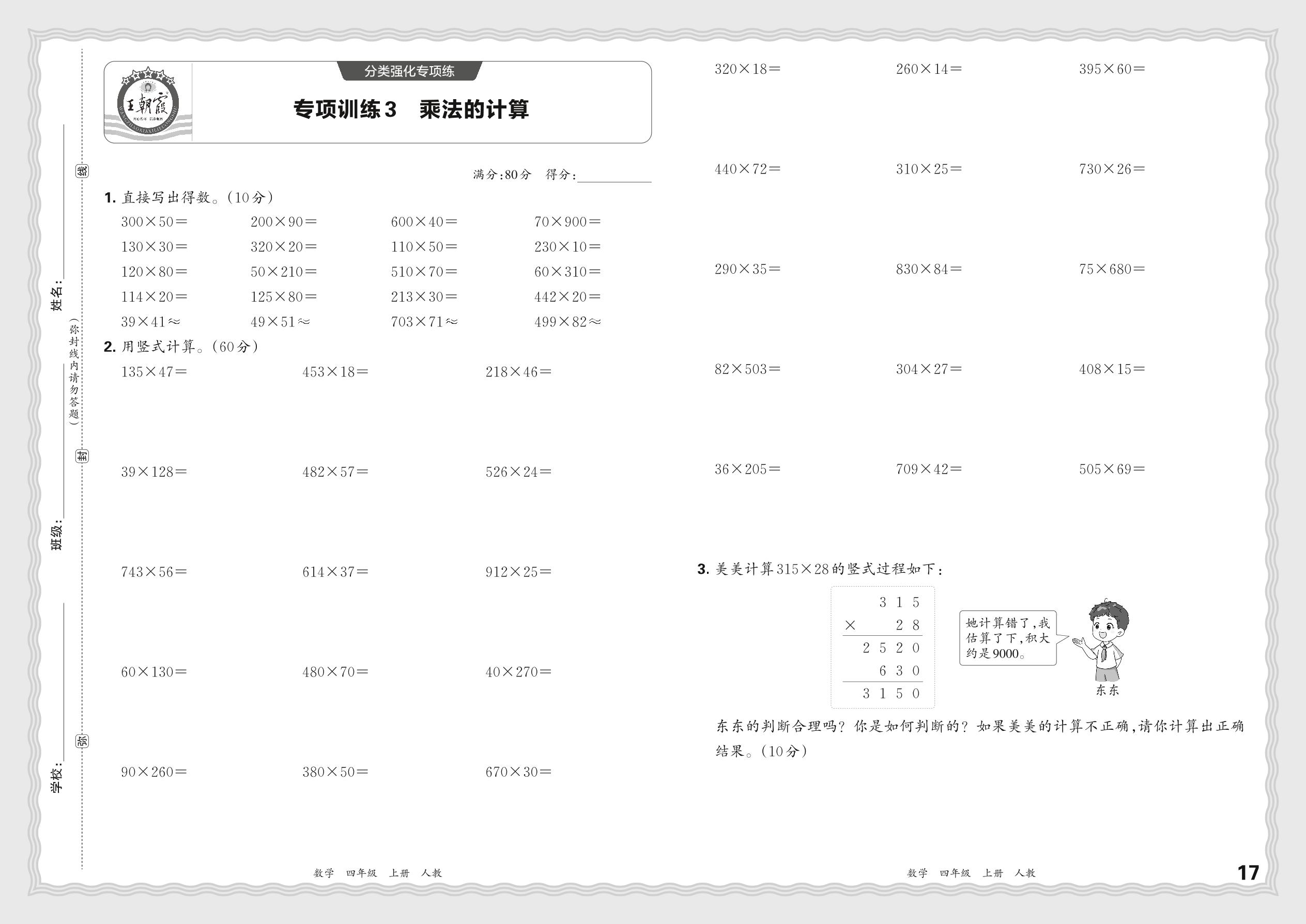 2023秋上册四年级数学人教版 期末专项·乘法的计算【3】