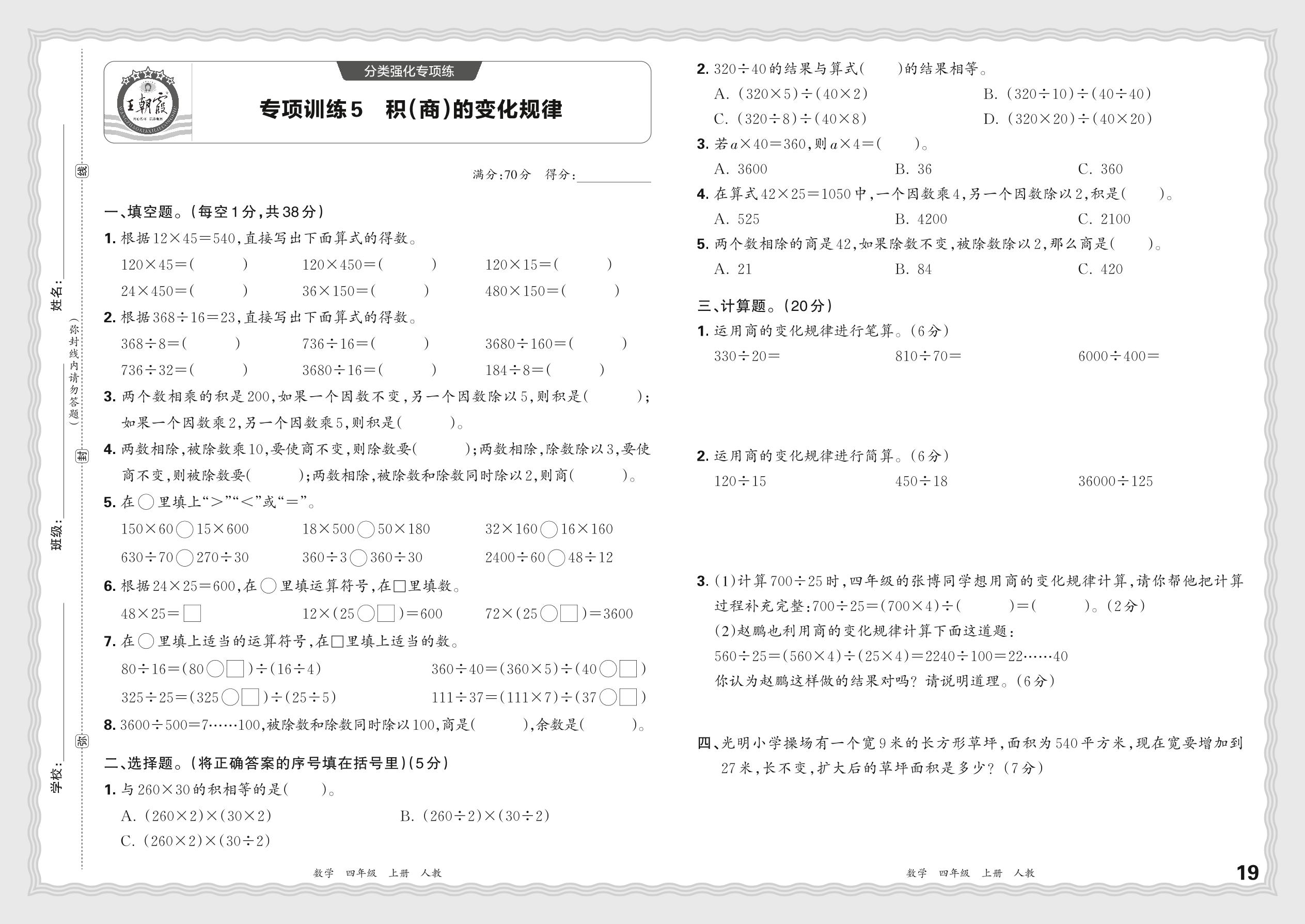 2023秋上册四年级数学人教版 期末专项·积(商)的变化规律【5】