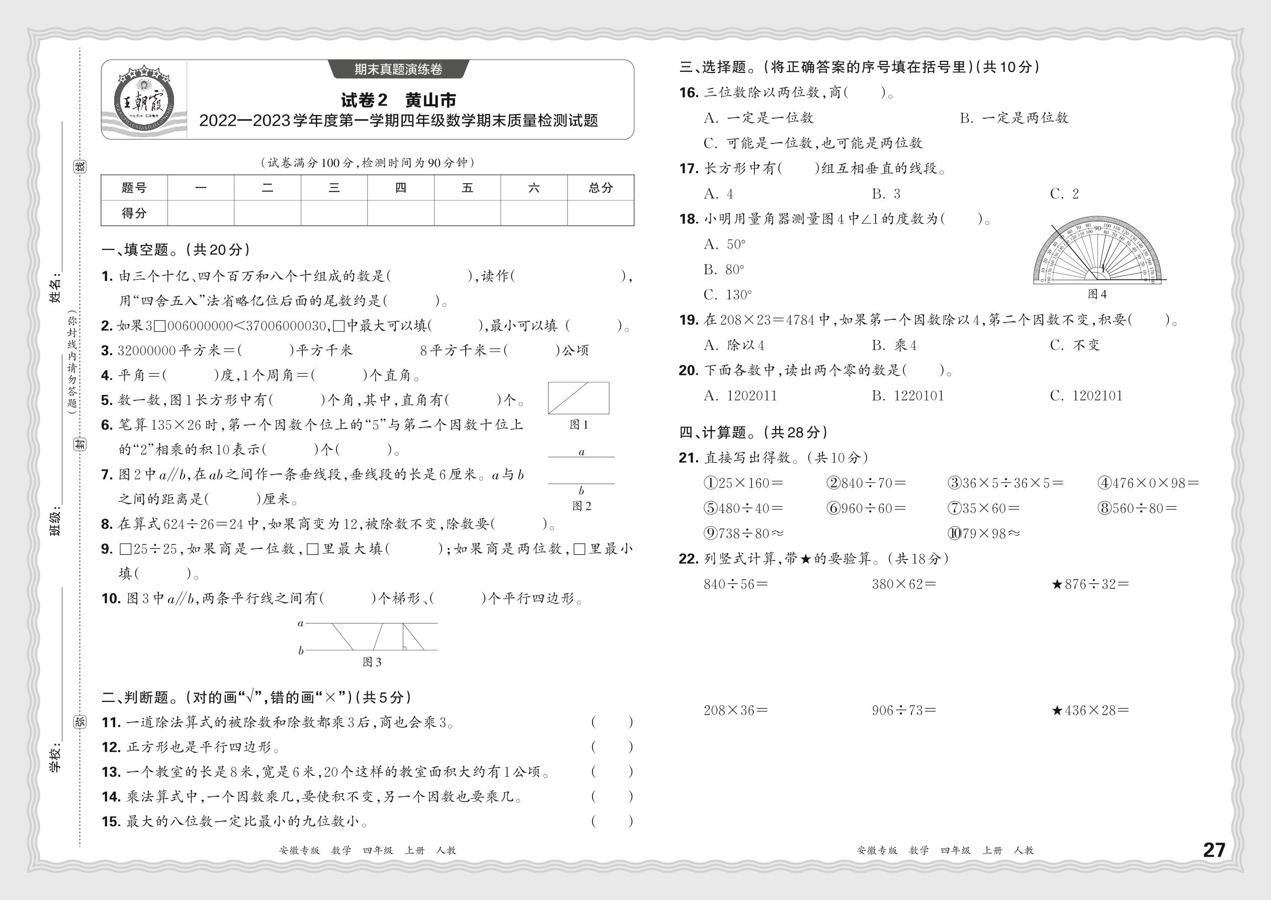 安徽省黄山市2022—2023学年度第一学期四年级数学期末质量检测试题(人教版)【2】