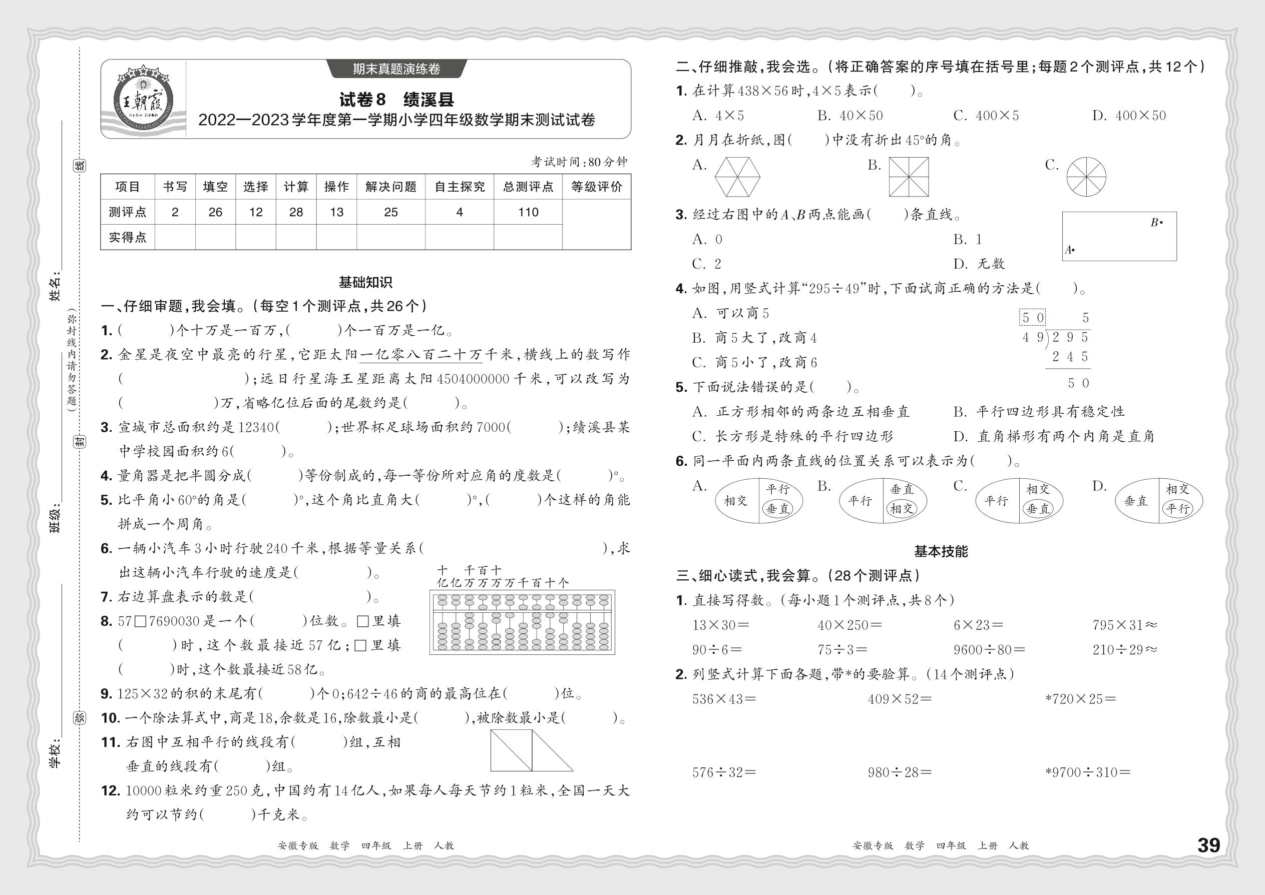 安徽省宣城市绩溪县2022—2023学年度第一学期小学四年级数学期末测试试卷(人教版)【8】