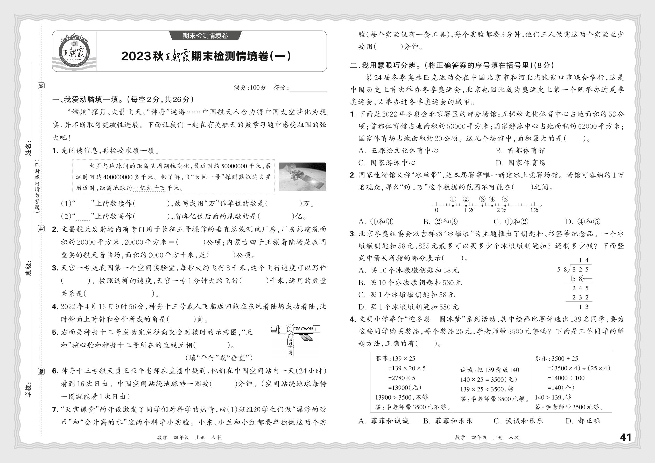 2023秋上册四年级数学人教版 王朝霞期末检测情境卷(一)