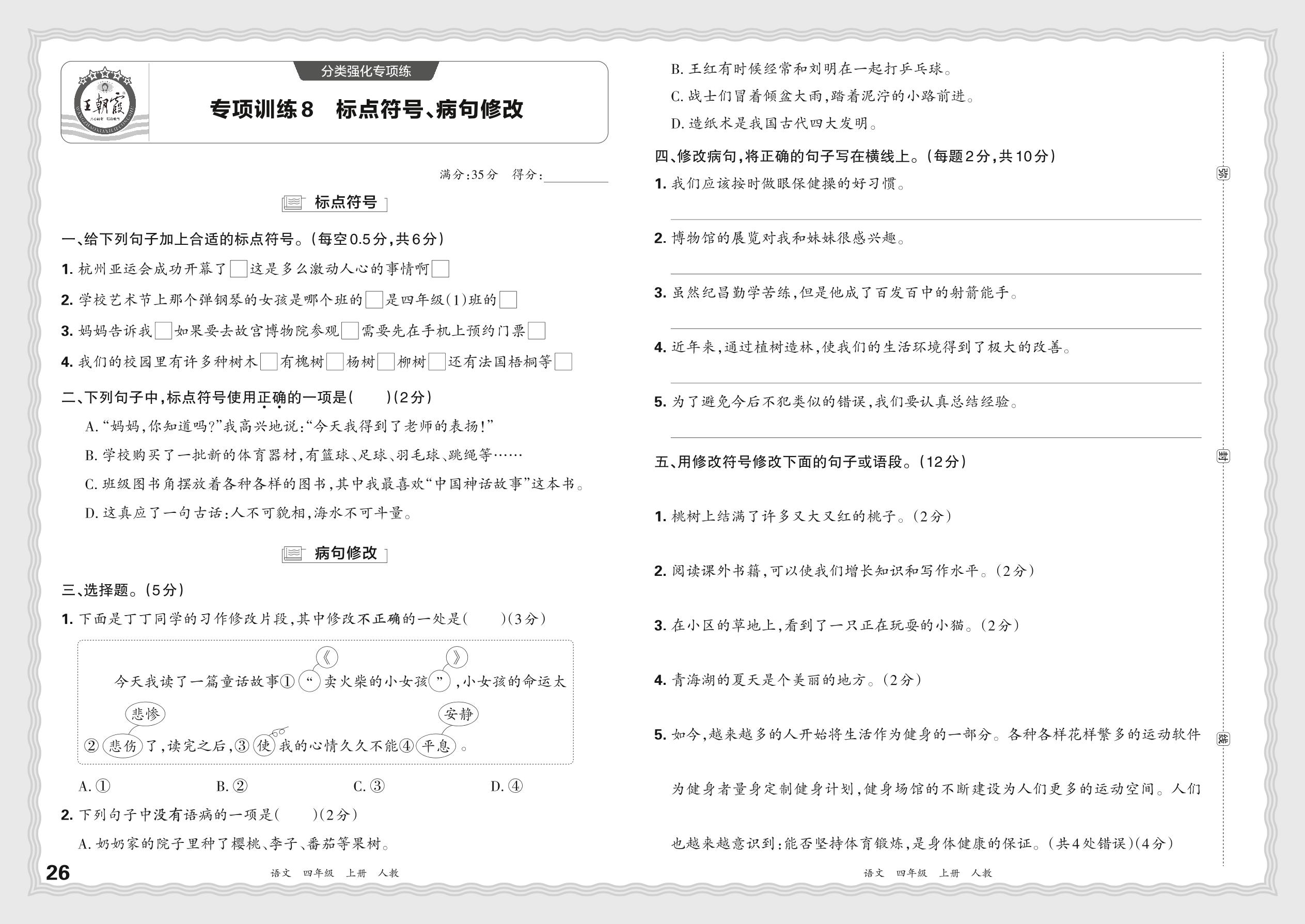 2023秋上册四年级语文人教版 期末专项·标点符号、病句修改【8】