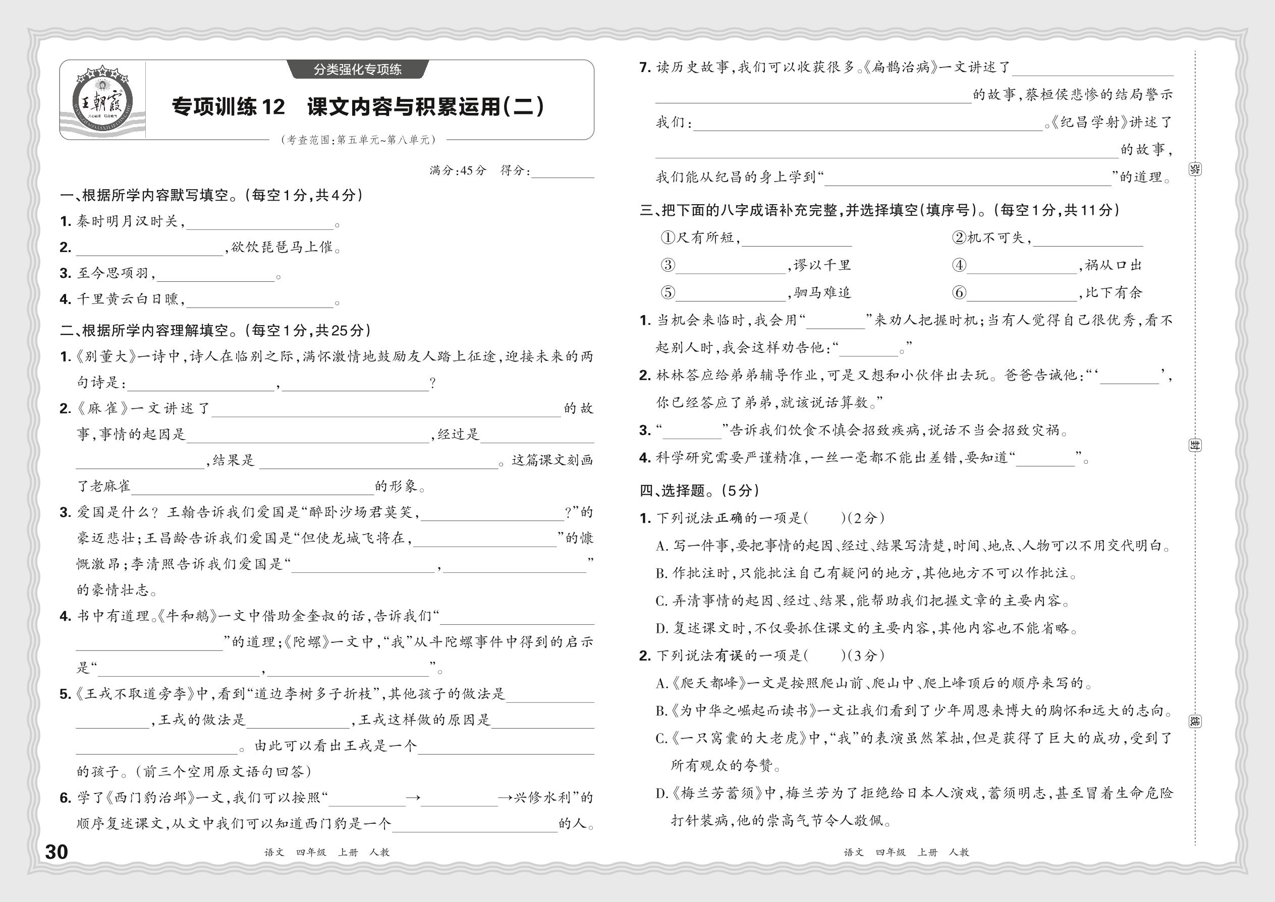 2023秋上册四年级语文人教版 期末专项·课文内容与积累运用(二)【12】