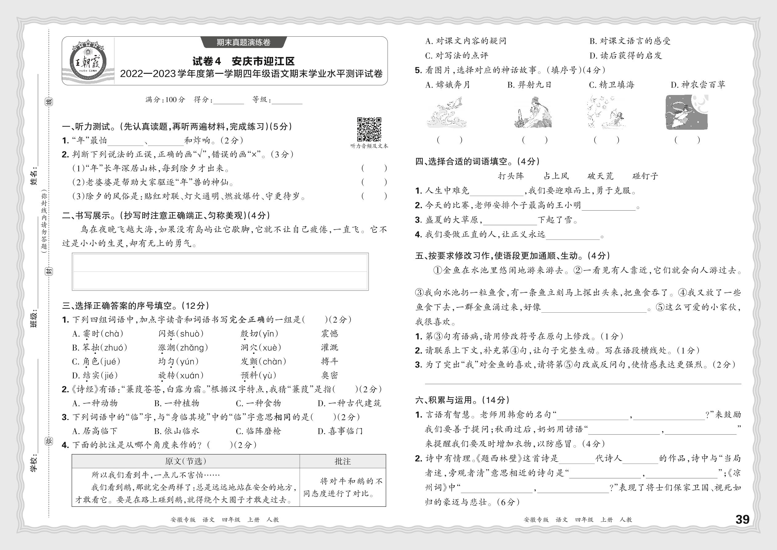 安徽省安庆市迎江区2022—2023学年度第一学期四年级语文期末学业水平测评试卷(人教版)【4】