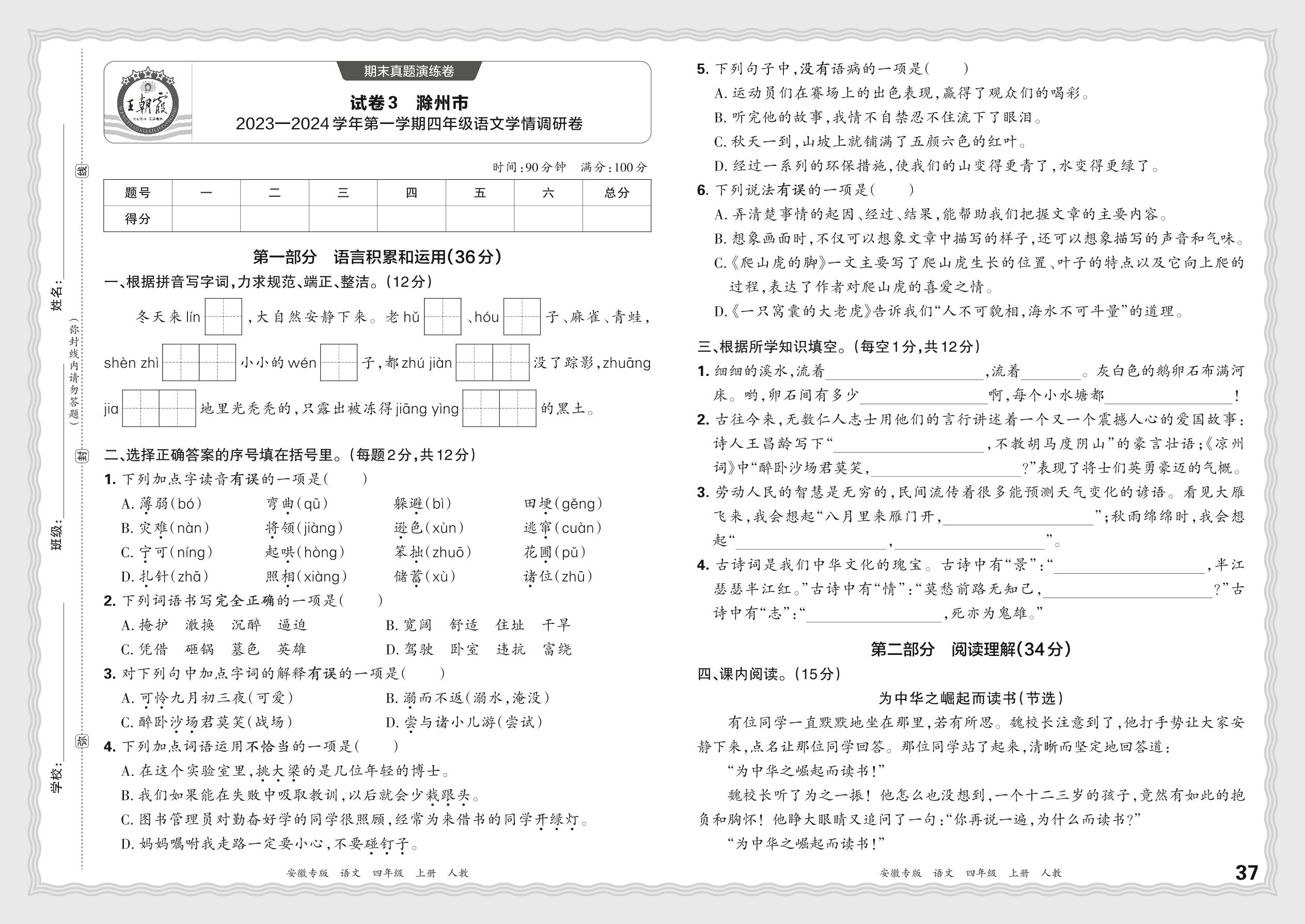 安徽省滁州市2023—2024学年第一学期四年级语文学情调研卷(人教版)【3】