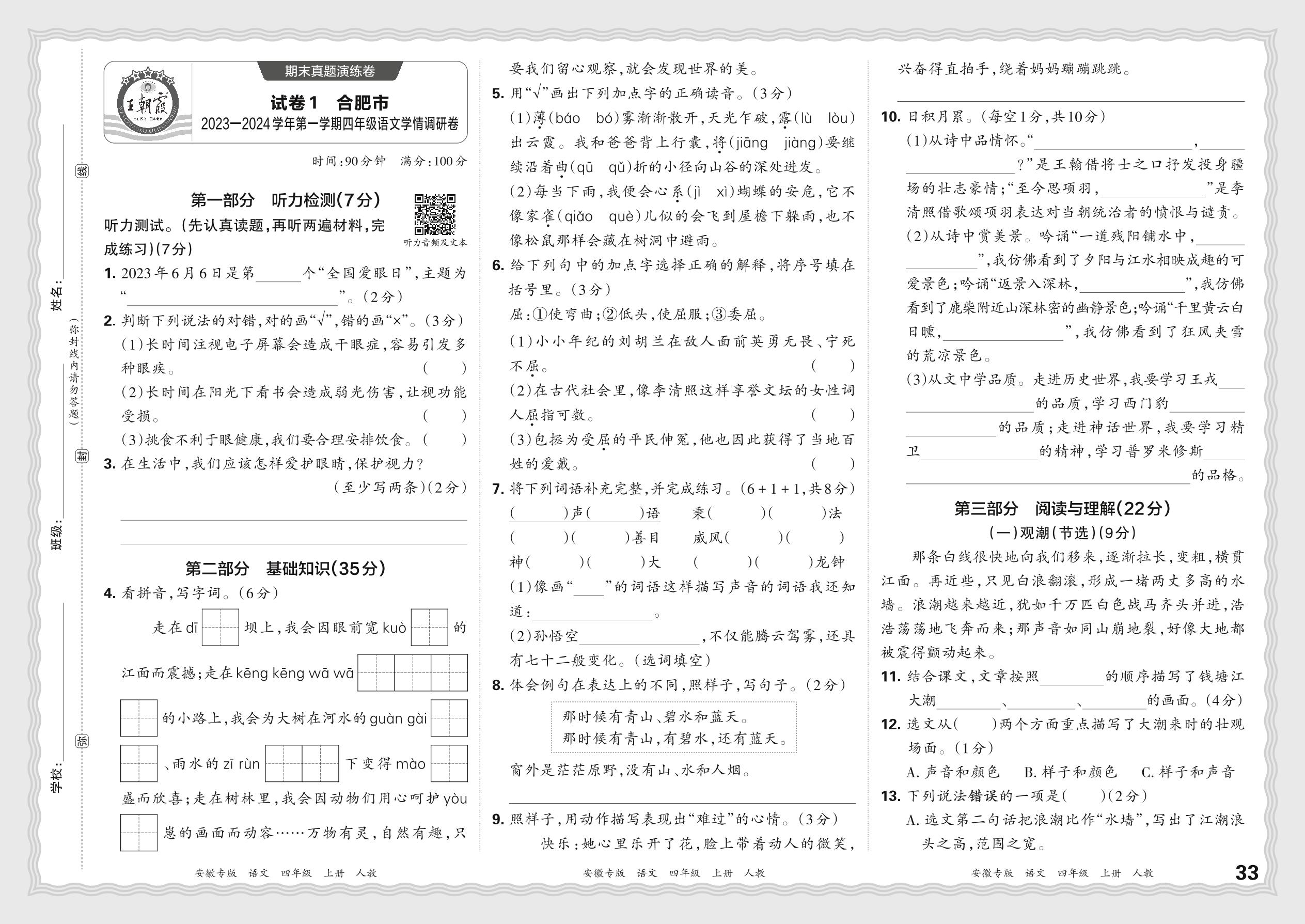 安徽省合肥市2023—2024学年第一学期四年级语文学情调研卷(人教版)【1】