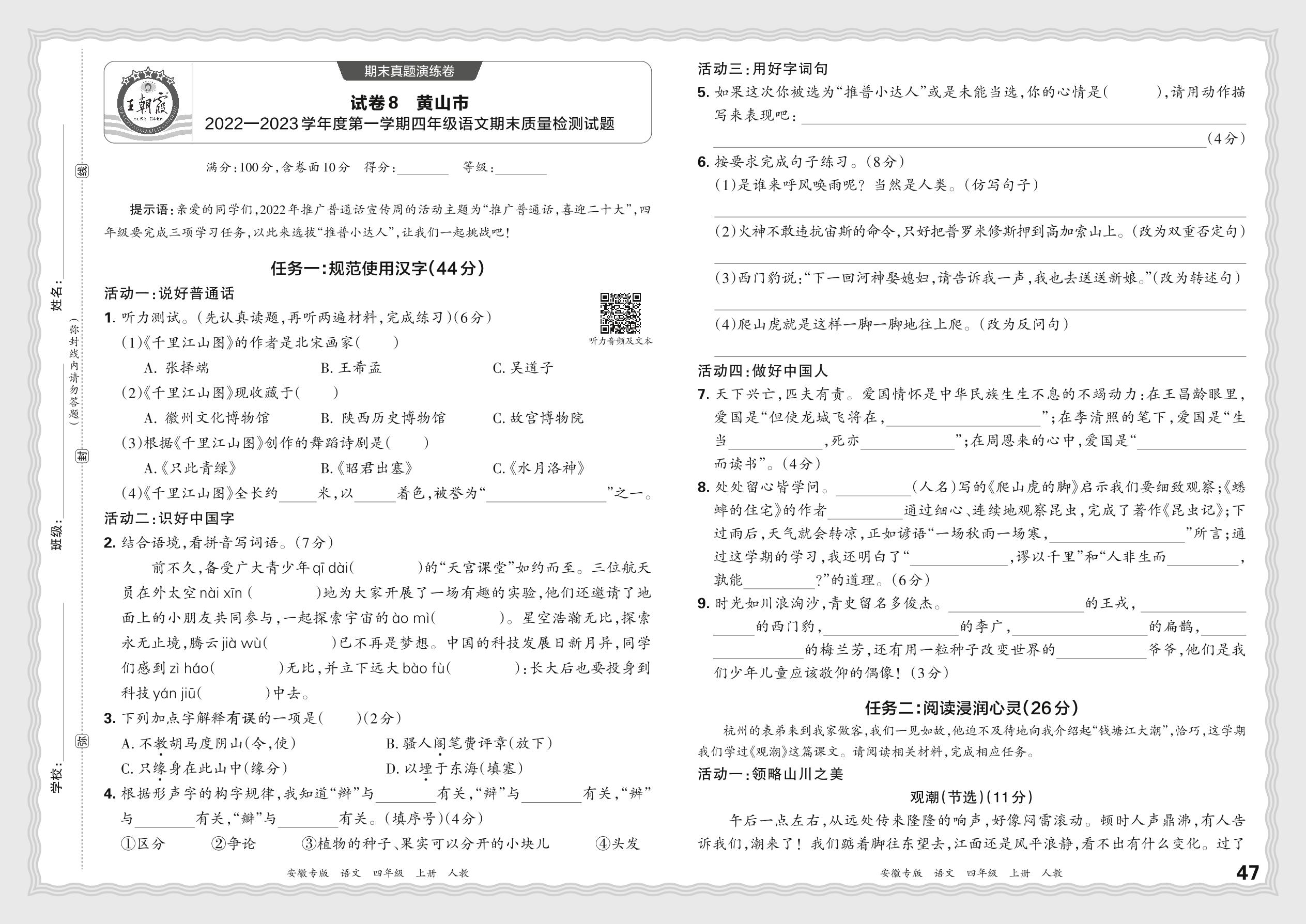 安徽省黄山市2022—2023学年度第一学期四年级语文期末质量检测试题(人教版)【8】