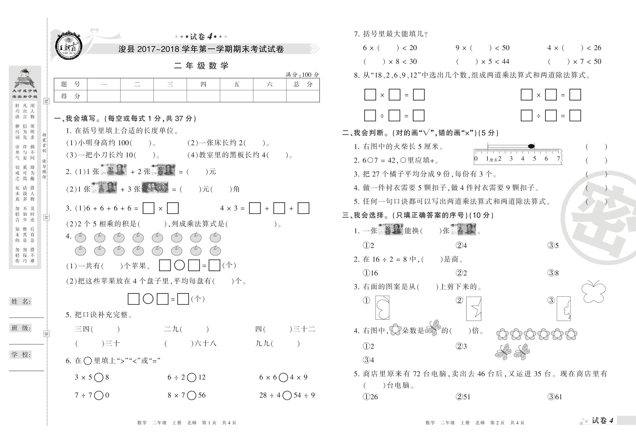 2017-2018学年第一学期鹤壁市浚县二年级数学试卷(北师版)【4】
