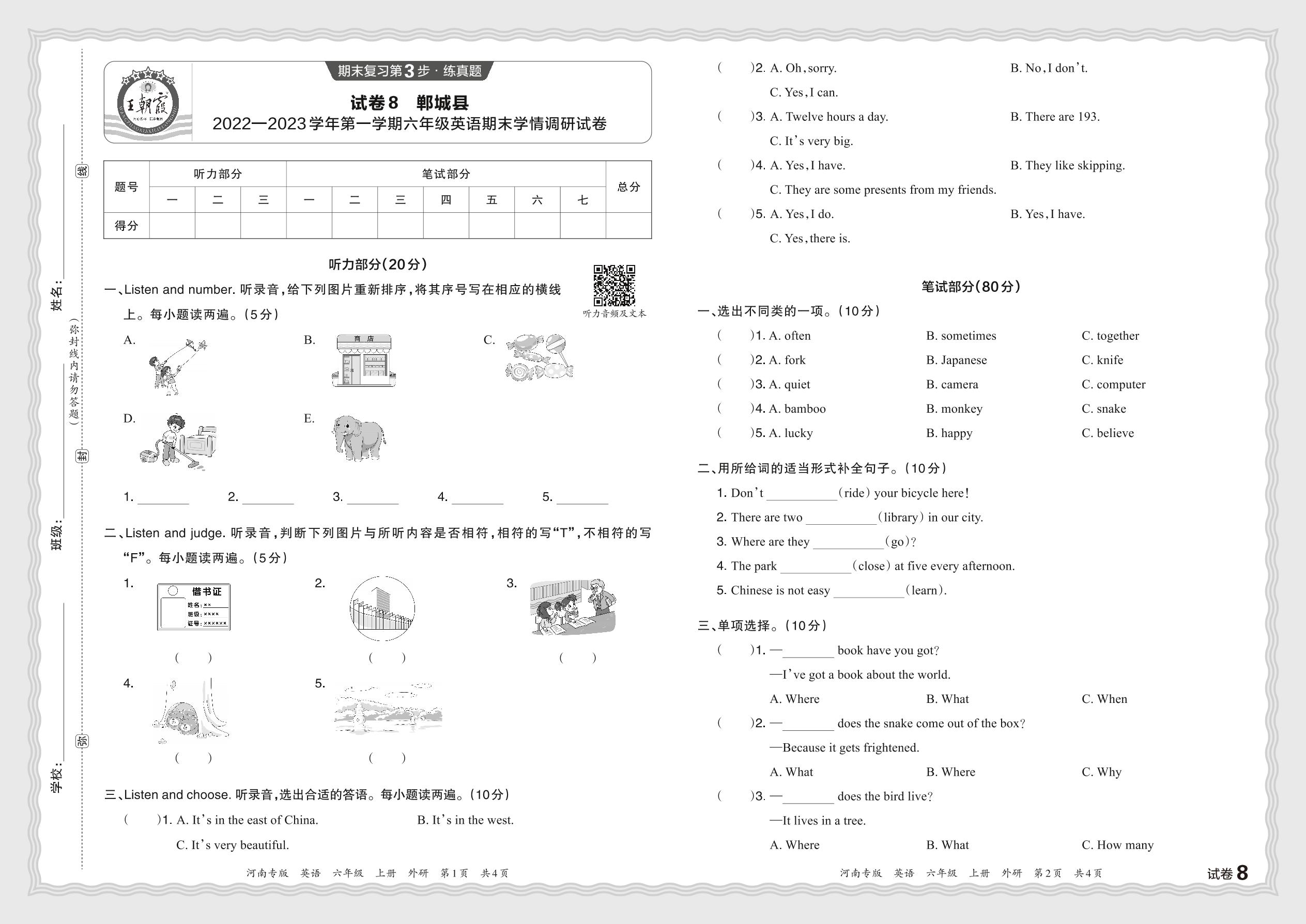 河南省周口市郸城县2022—2023学年第一学期六年级英语期末学情调研试卷(外研版)【8】