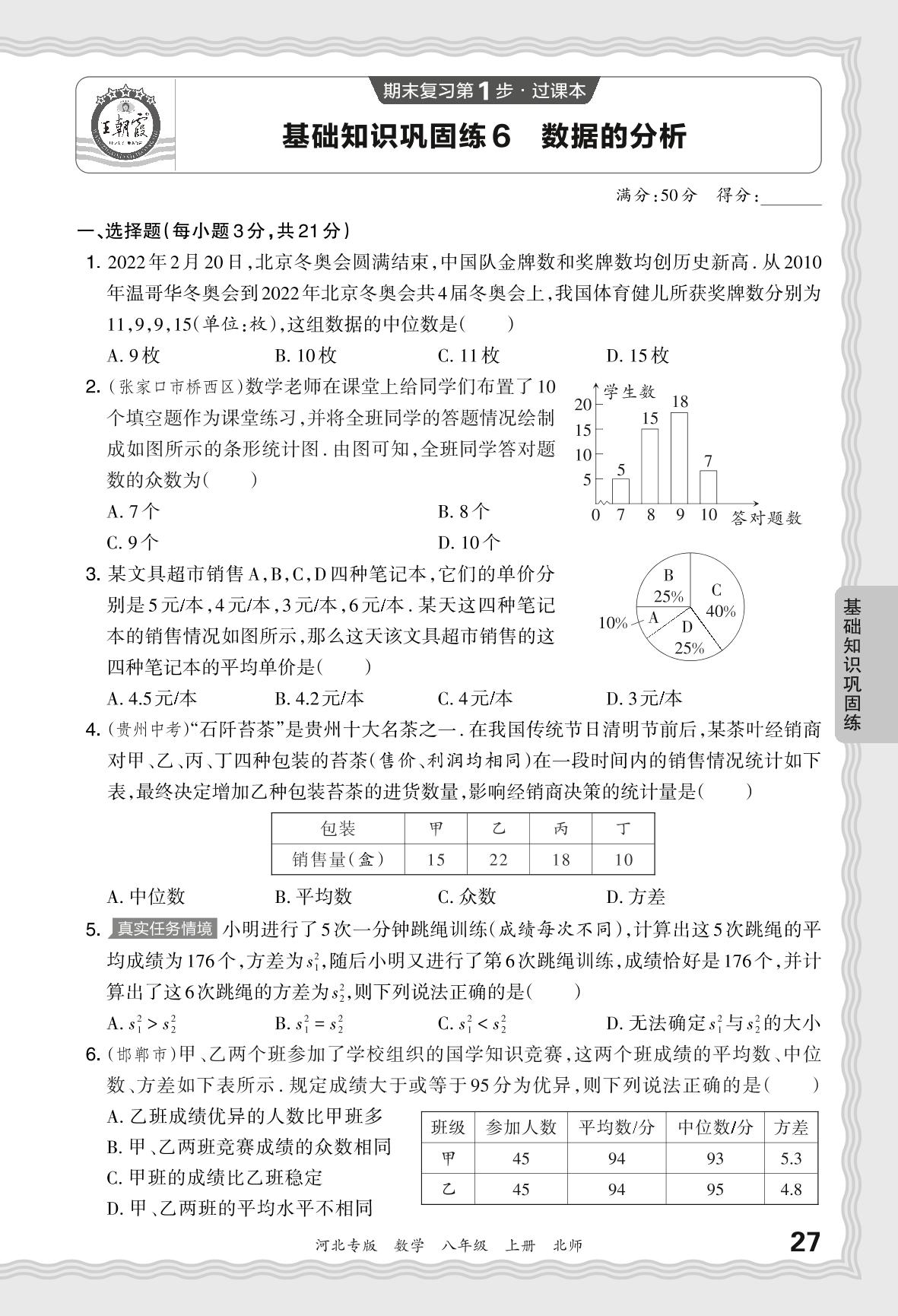 2023秋上册八年级数学北师版 期末过课本·基础知识巩固练 数据的分析【6】