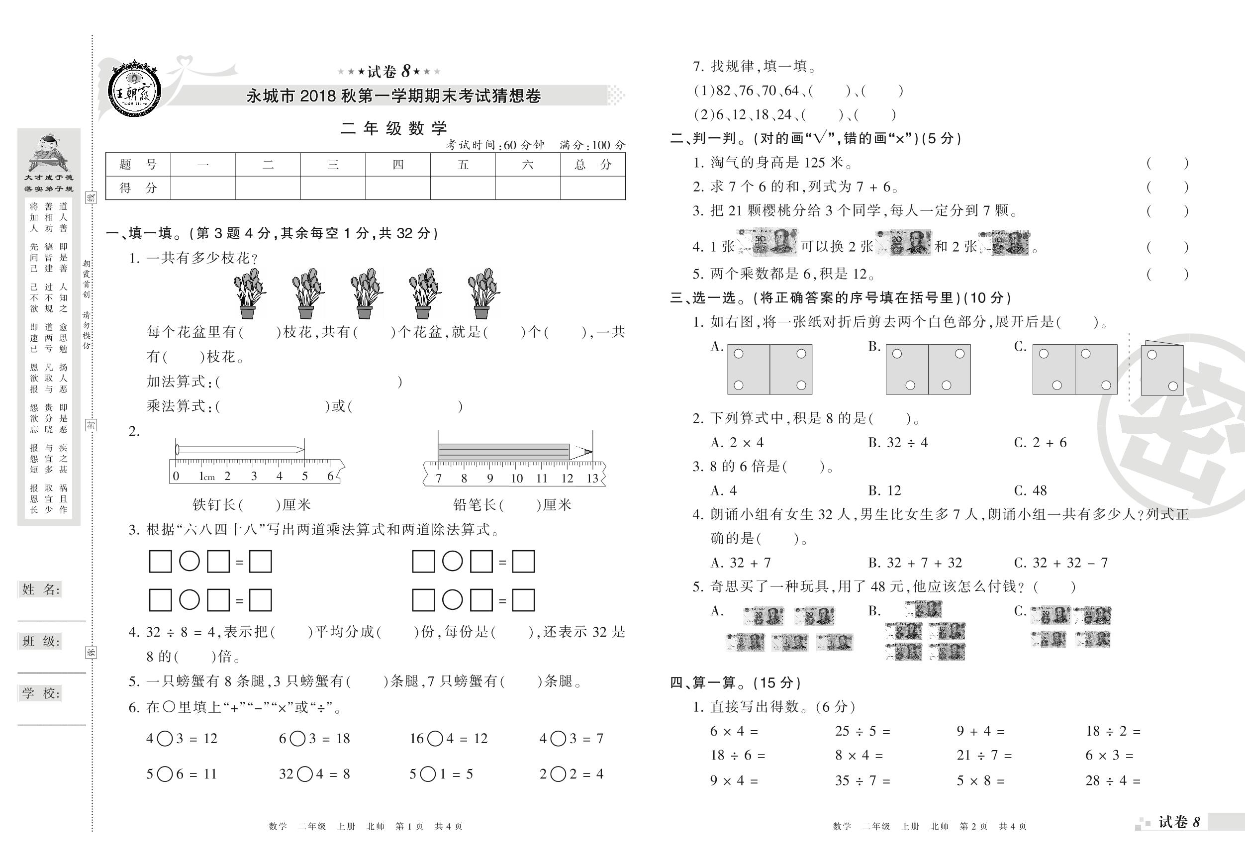 2017-2018学年第一学期商丘市永城县二年级数学试卷(北师版)【8】