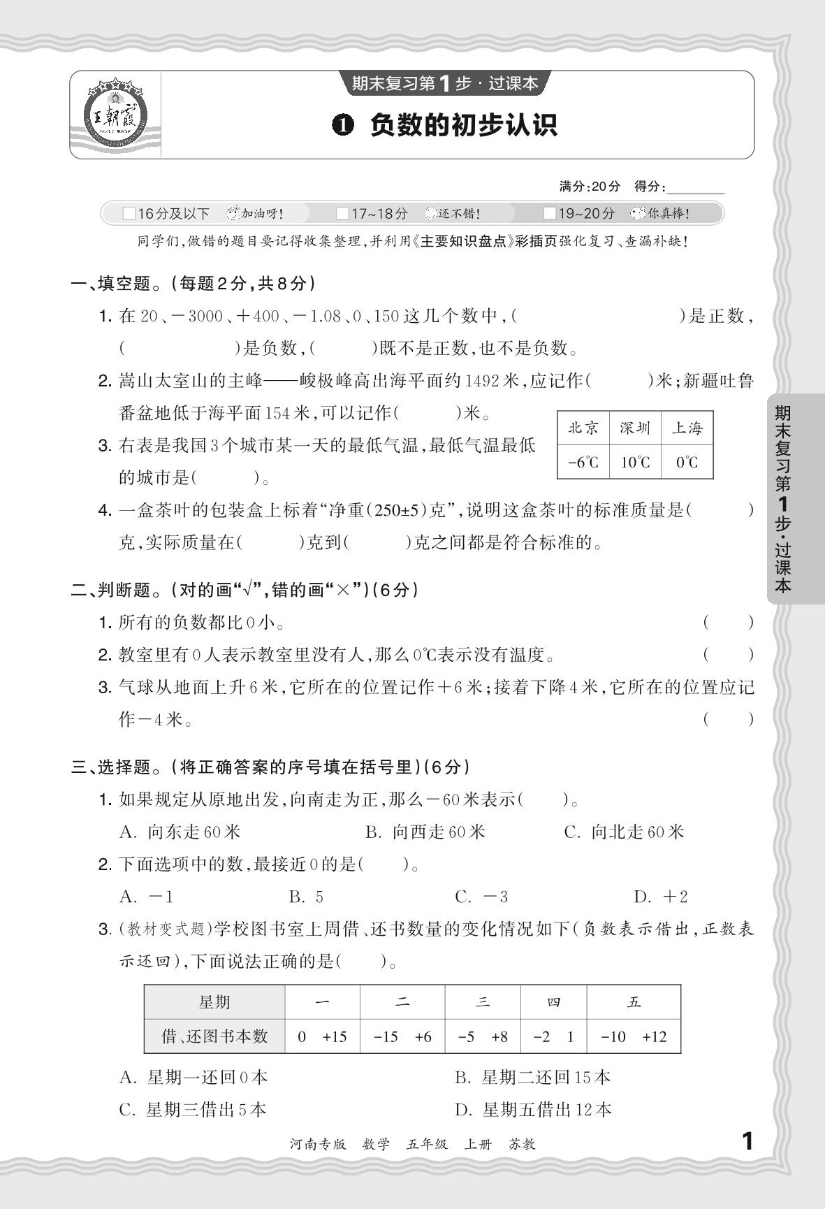 2023秋上册五年级数学苏教版 期末过课本QMA版·负数的初步认识【1】