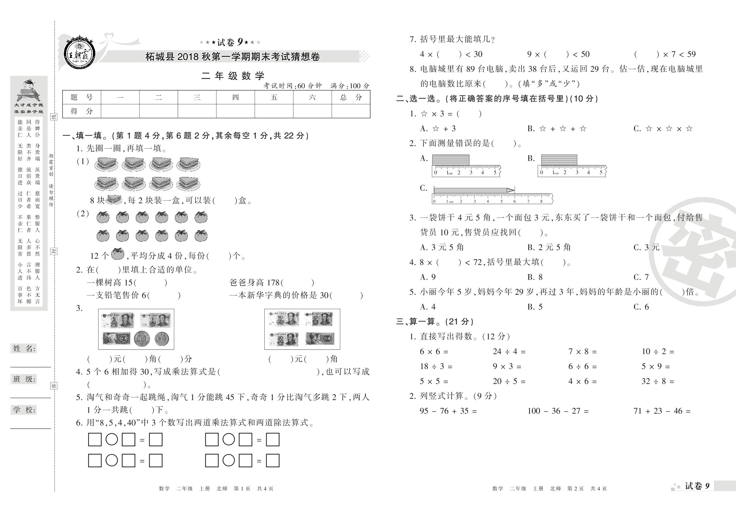 2017-2018学年第一学期商丘市柘城县二年级数学试卷(北师版)【9】