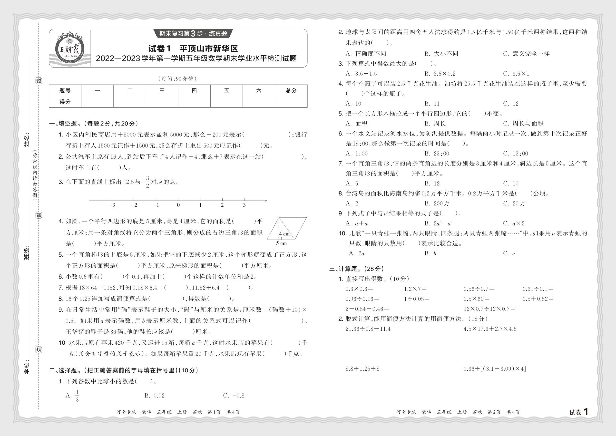 河南省平顶山市新华区2022-2023学年第一学期五年级数学期末学业水平检测试题(苏教版)【1】