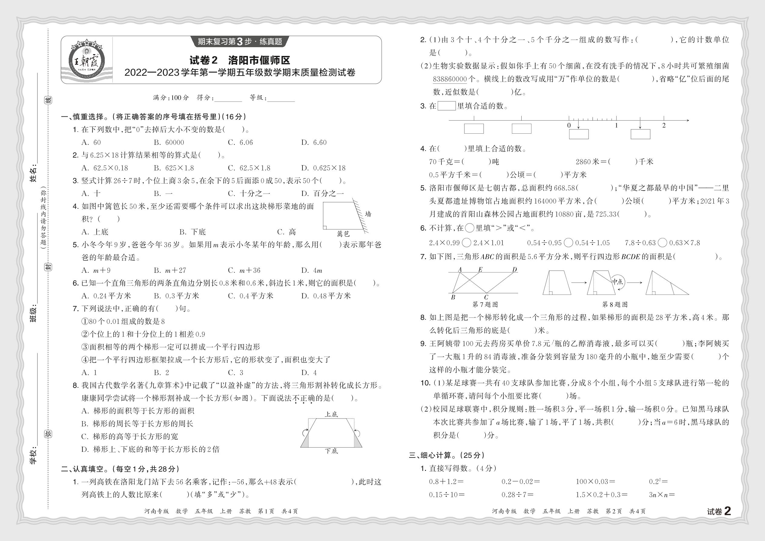 河南省洛阳市偃师区2022—2023学年第一学期五年级数学期末质量检测试卷(苏教版)【2】