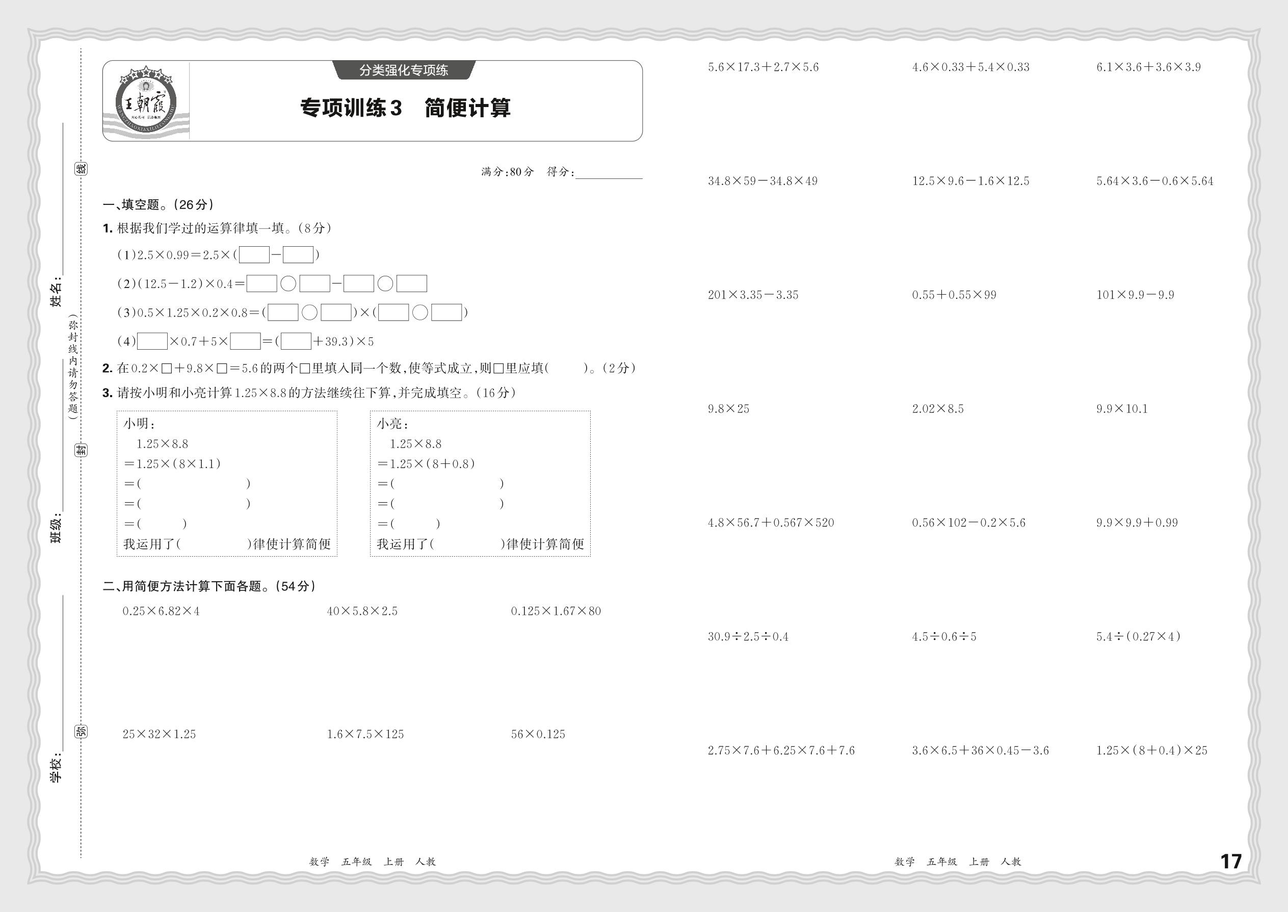 2023秋上册五年级数学人教版 期末专项·简便计算【3】