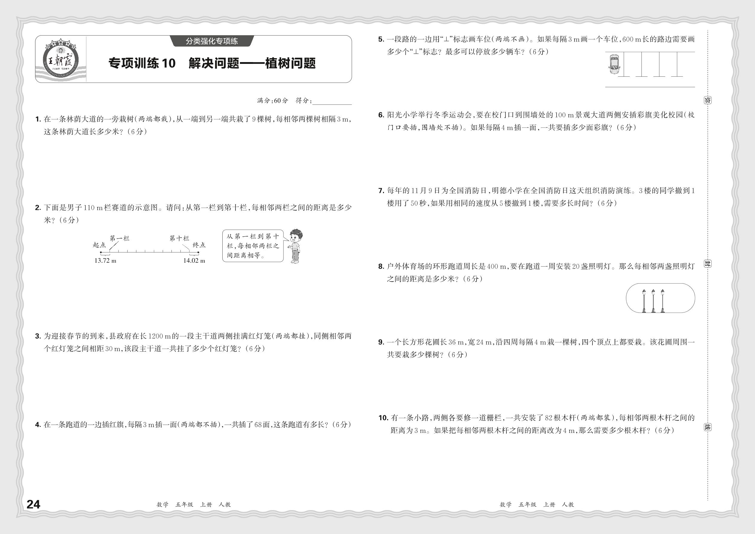 2023秋上册五年级数学人教版 期末专项·解决问题——植树问题【10】