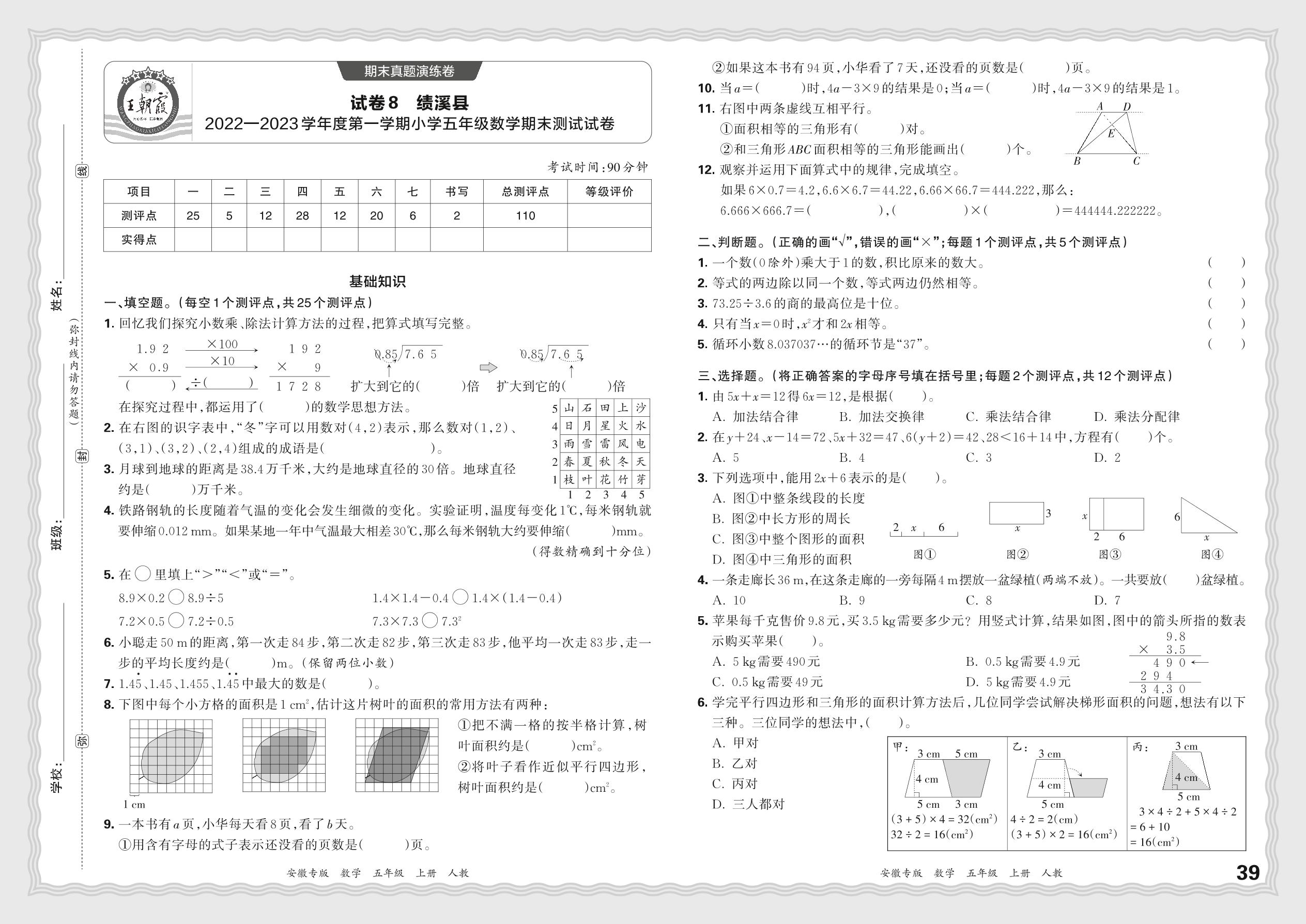 安徽省宣城市绩溪县2022—2023学年度第一学期小学五年级数学期末测试试卷(人教版)【8】