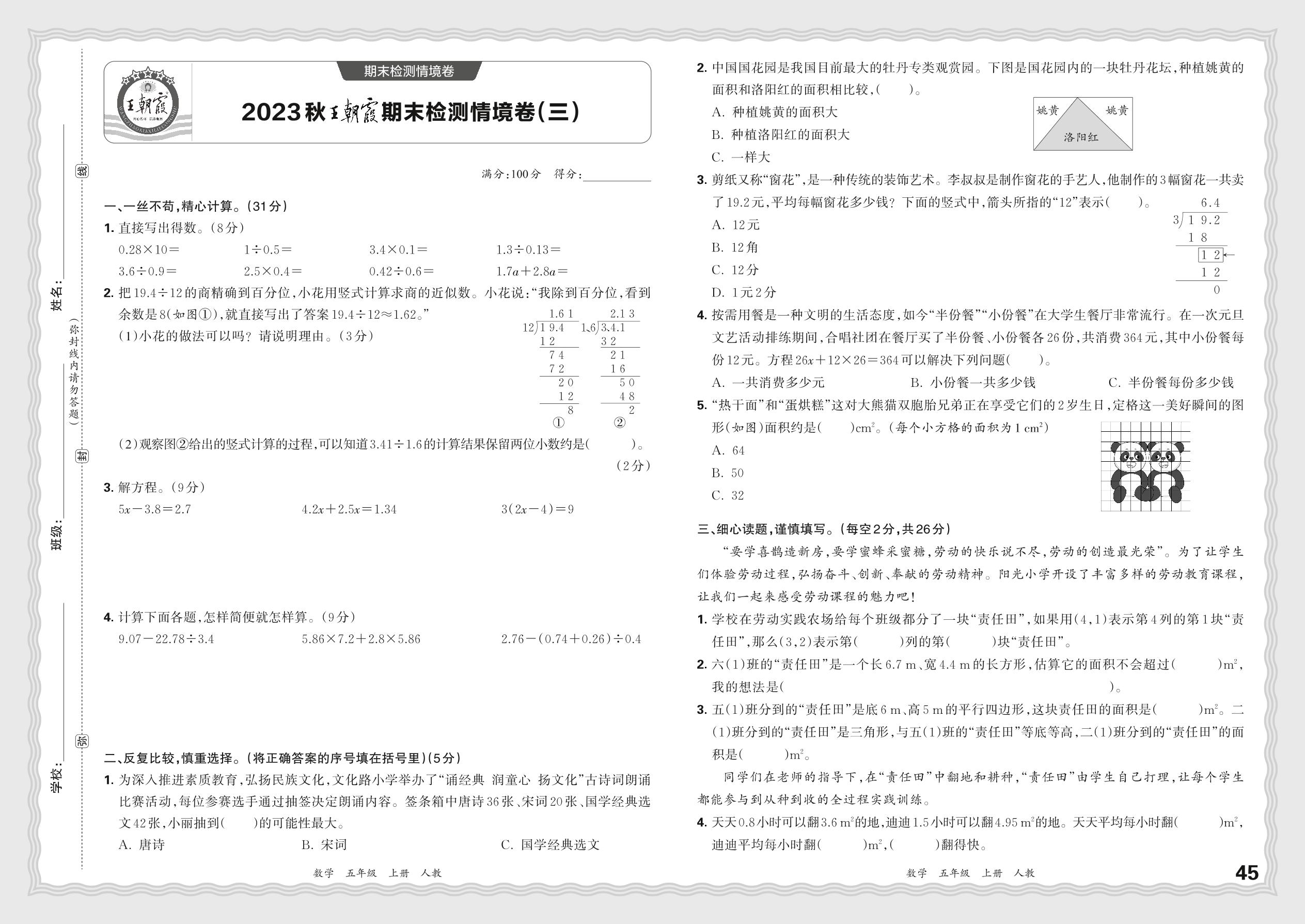 2023秋上册五年级数学人教版 王朝霞期末检测情境卷(三)