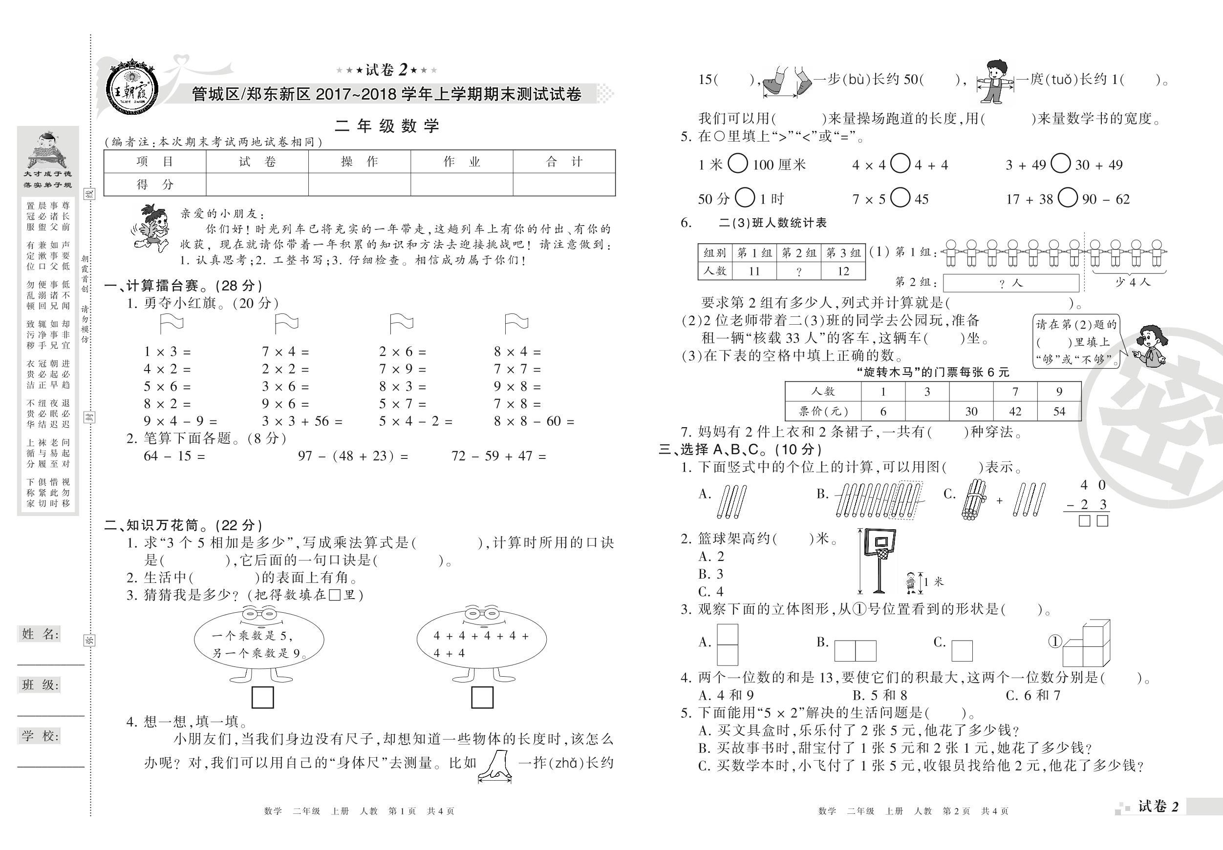 2017-2018学年第一学期郑州市管城区、郑东新区二年级数学试卷(人教版)【2】