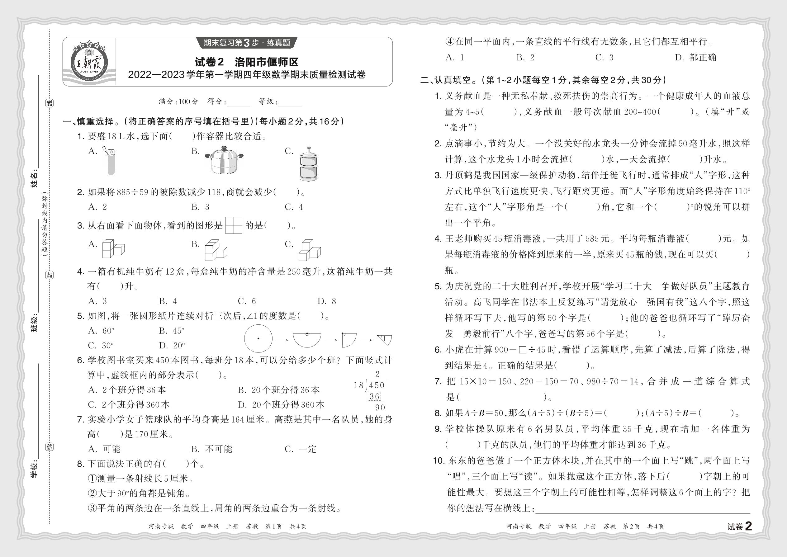 河南省洛阳市偃师区2022—2023学年第一学期四年级数学期末质量检测试卷(苏教版)【2】