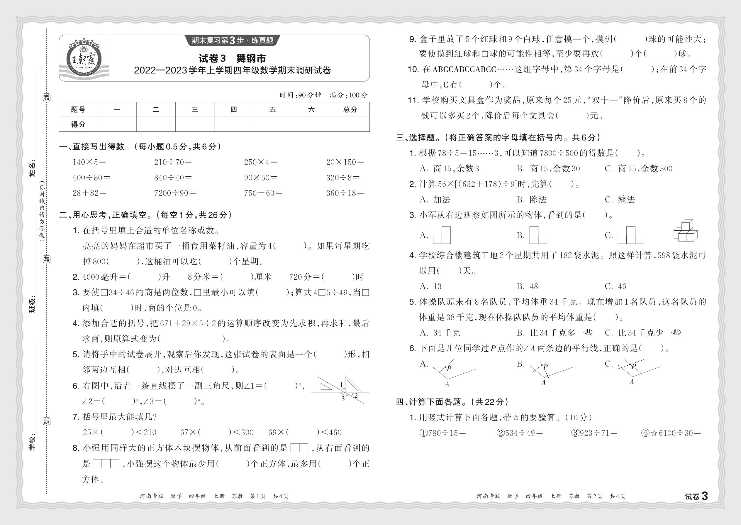 河南省平顶山市舞钢市2022—2023学年上学期四年级数学期末调研试卷(苏教版)【3】