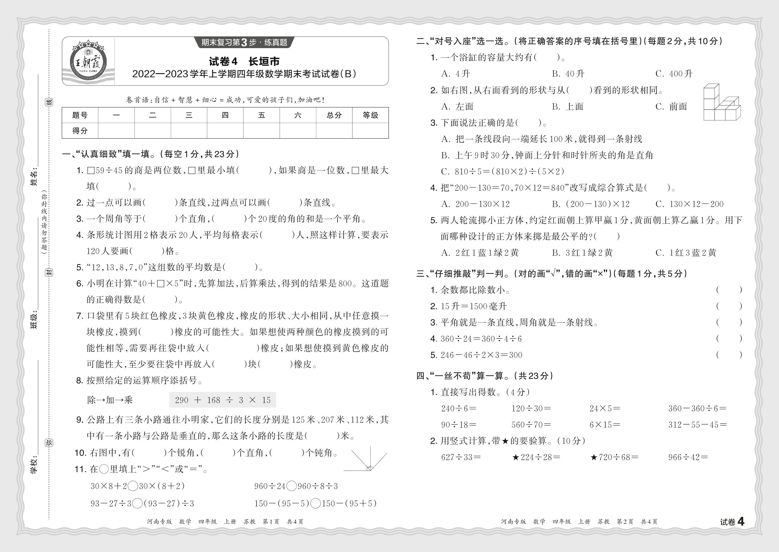 河南省新乡市长垣市2022—2023学年上学期四年级数学期末考试试卷(B)(苏教版)【4】