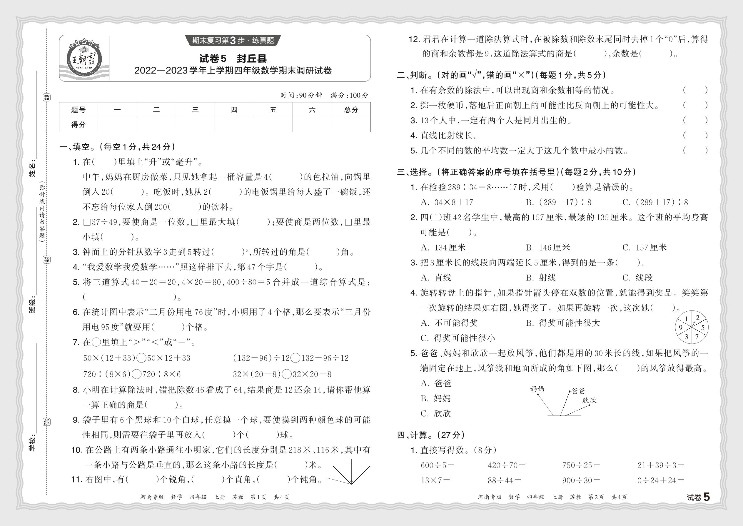 河南省新乡市封丘县2022—2023学年上学期四年级数学期末调研试卷(苏教版)【5】
