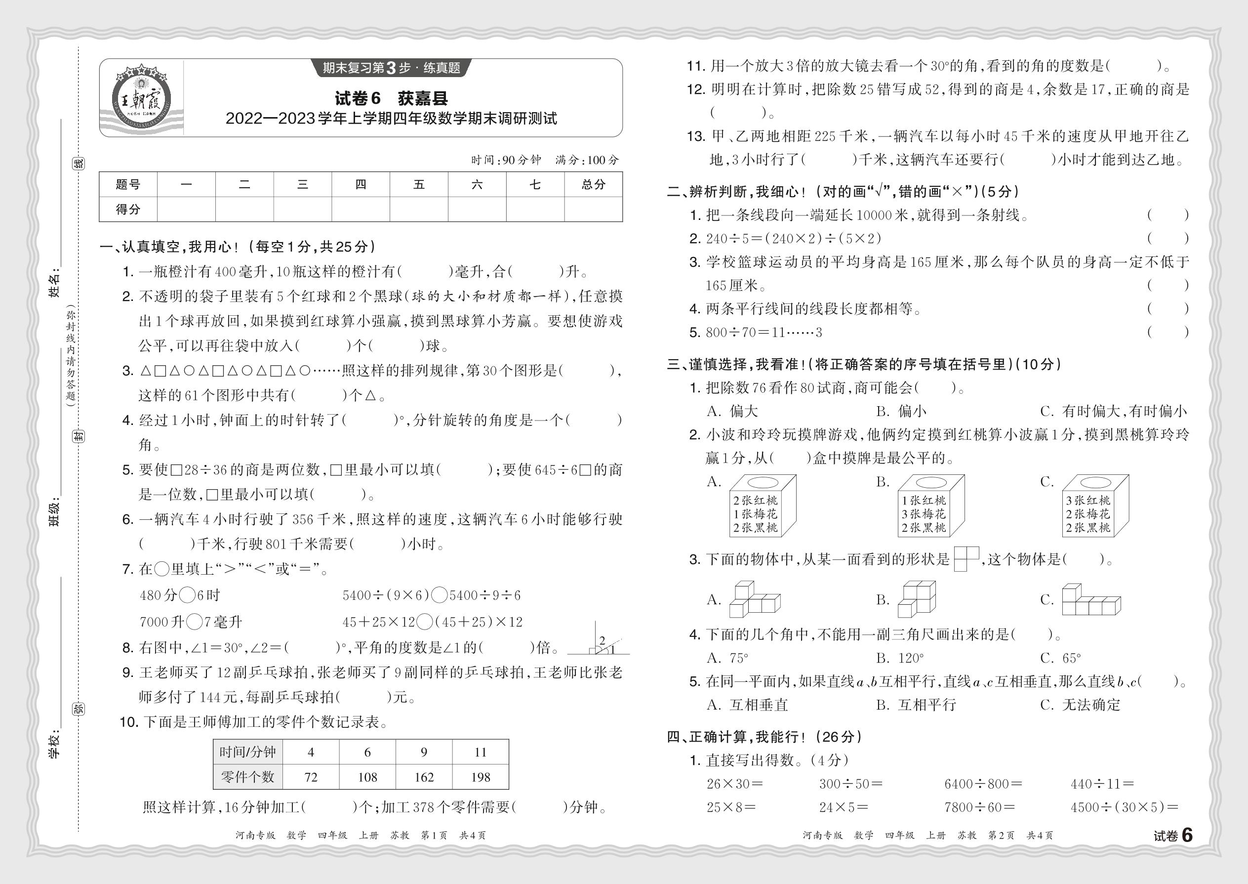 河南省新乡市获嘉县2022—2023学年上学期四年级数学期末调研测试(苏教版)【6】