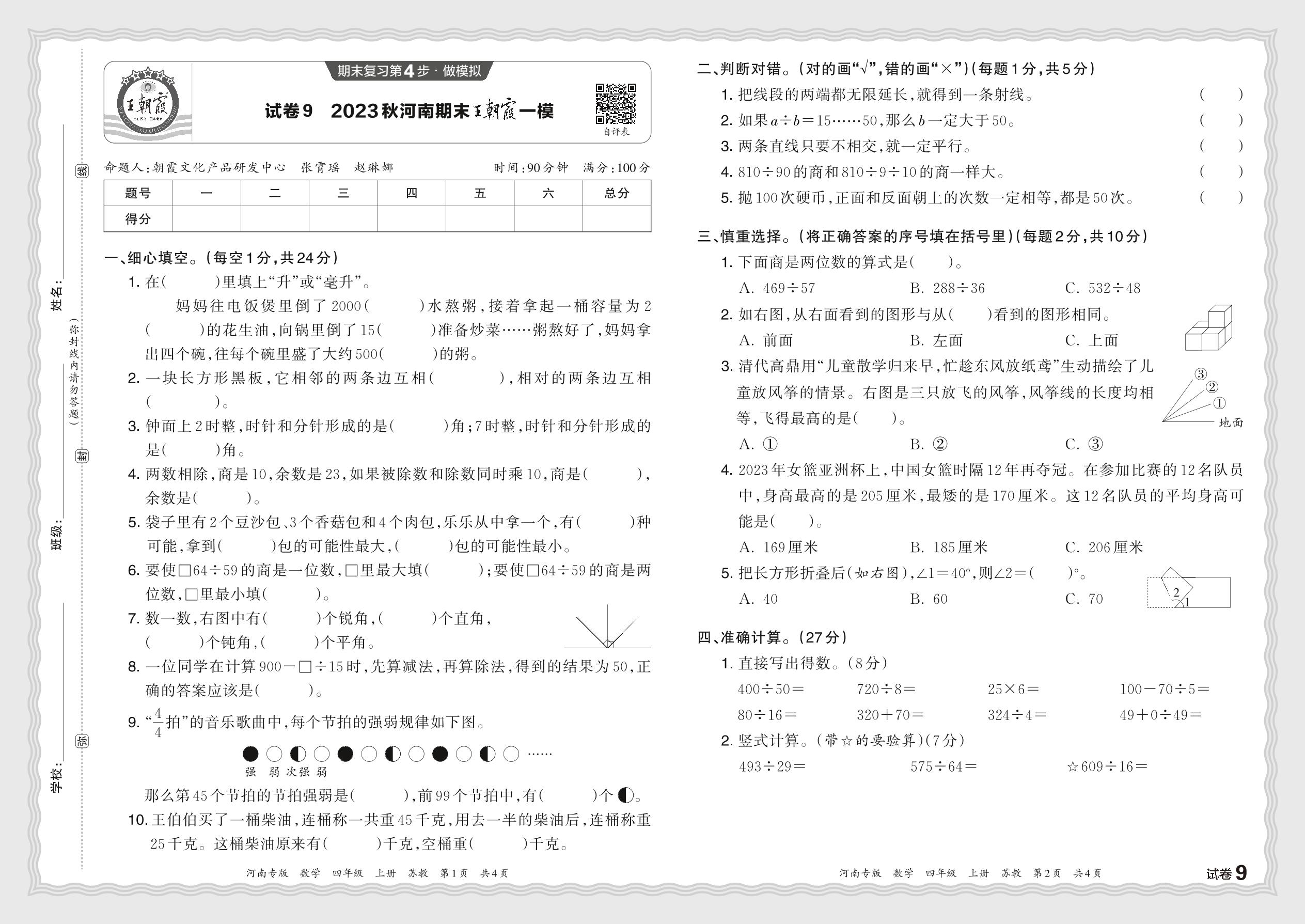 2023秋上册四年级数学苏教版 河南期末王朝霞一模【9】