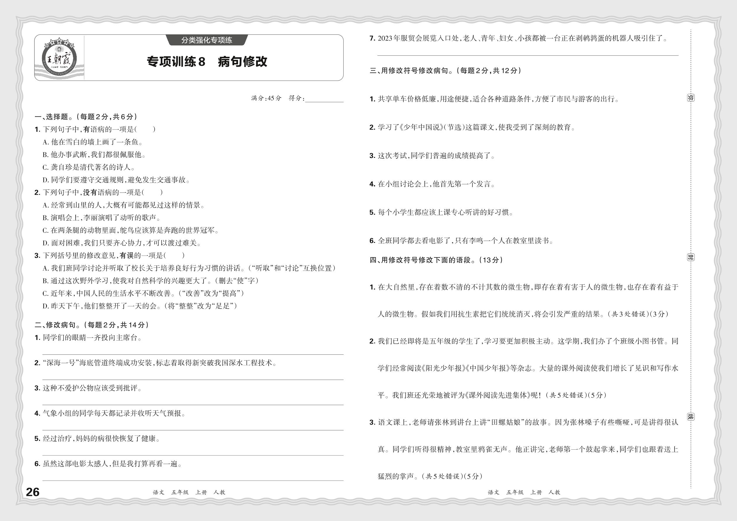 2023秋上册五年级语文人教版 期末专项·病句修改【8】
