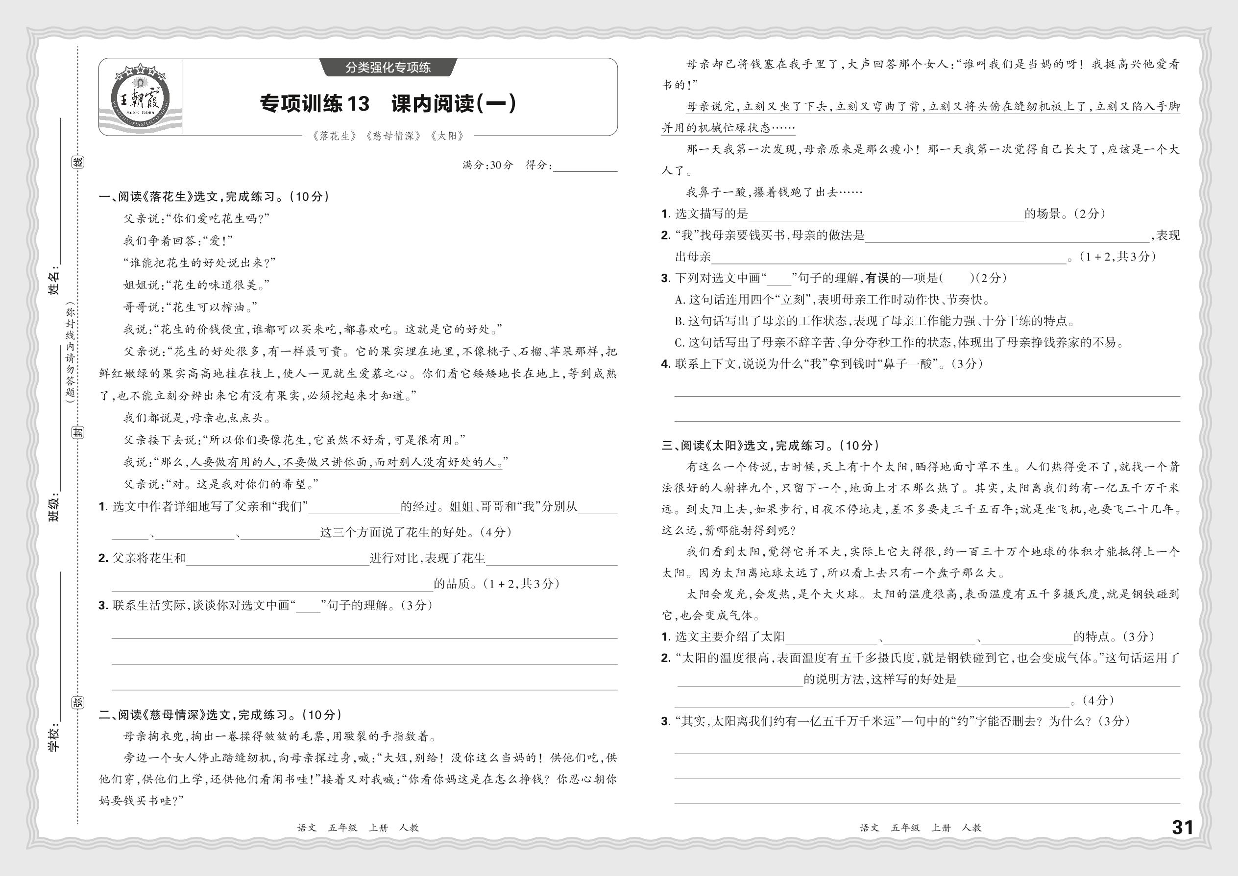 2023秋上册五年级语文人教版 期末专项·课内阅读(一)【13】