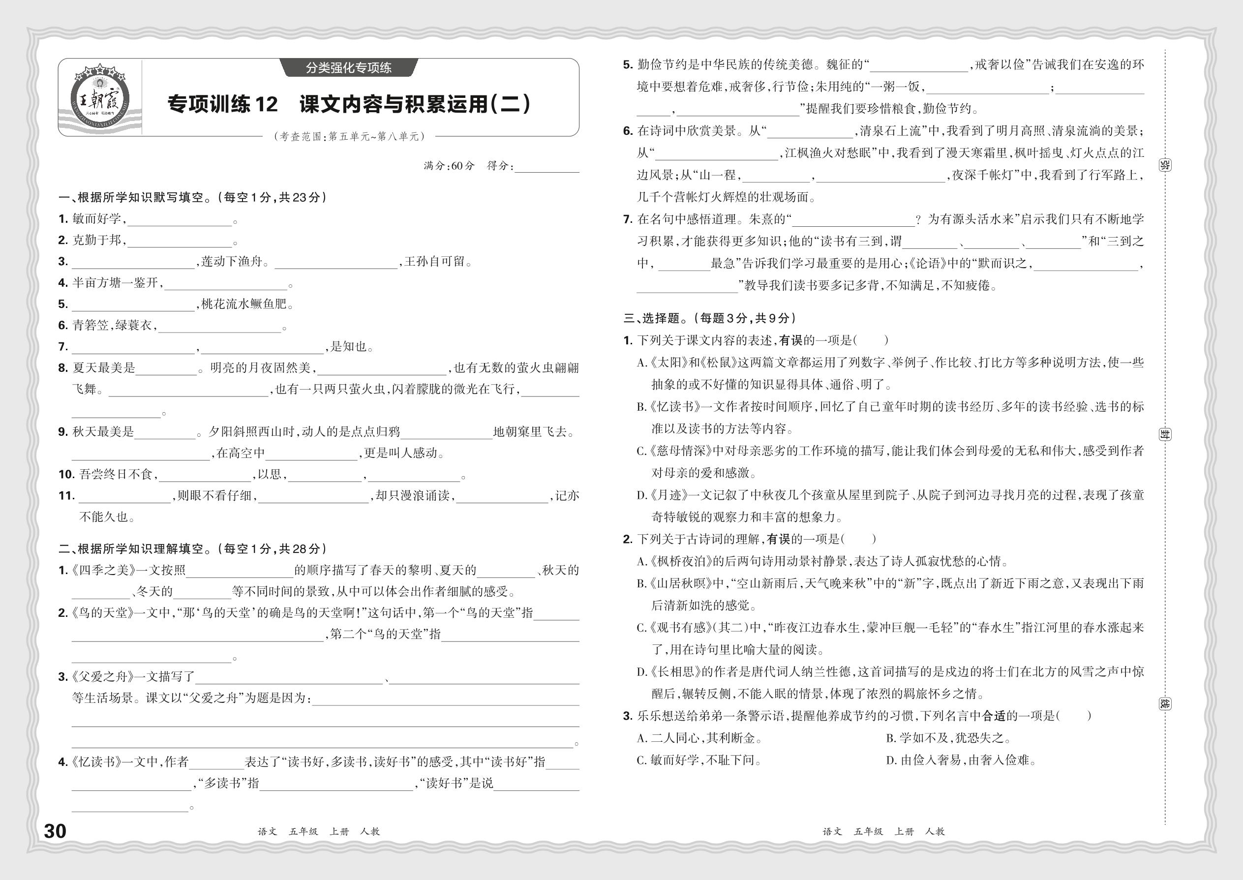 2023秋上册五年级语文人教版 期末专项·课文内容与积累运用(二)【12】